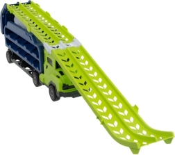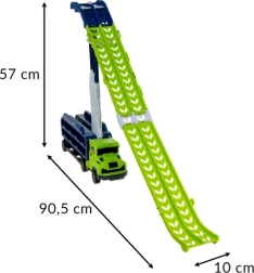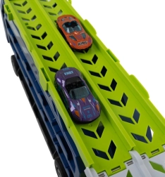 Velký přepravní kamion, který se promění v dvojitou závodní dráhu, přináší dětem hodiny akční zábavy. Součástí je 6 kovových autíček, skladování přímo v tahači a rychlé rozkládací rampy pro závody ve dvou pruzích. Díky třecímu pohonu autíčka samy jedou po postrčení a bezpečná konstrukce z kvalitních materiálů zajišťuje bezstarostné hraní.