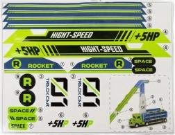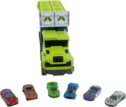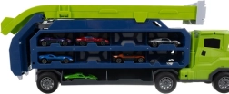 - Kamion s návěsem a dvojitou rampou, 6 kovových autíček, sada samolepek, návod, barevné dárkové balení, transportní karton