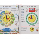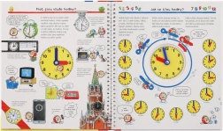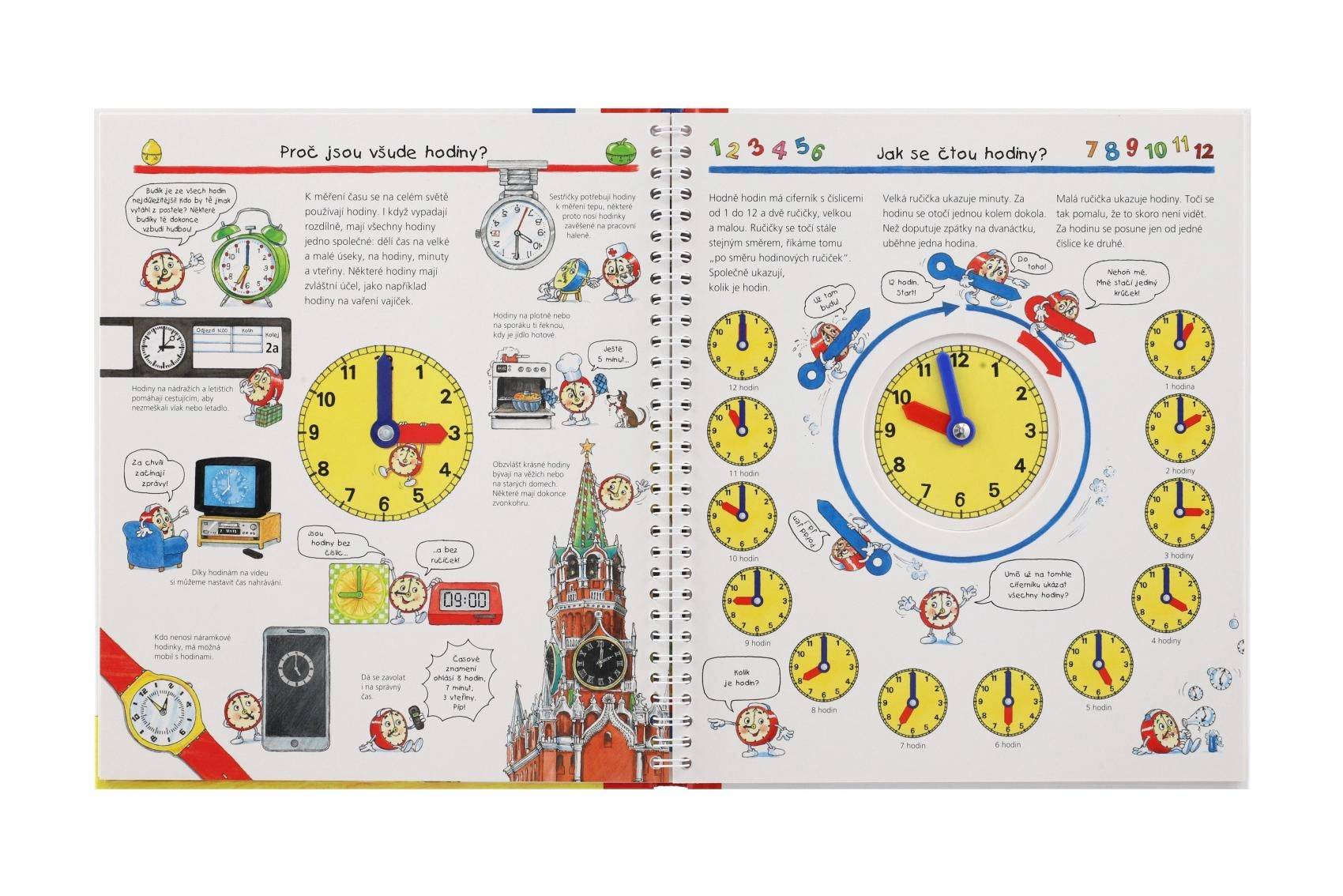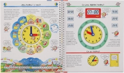 Interaktivní knížka s pohyblivými cvičnými hodinami motivuje děti k učení hravou formou. Díky srozumitelným úkolům a barevným ilustracím si snadno osvojí čtení času a pochopí základní souvislosti o čase během dne i noci.