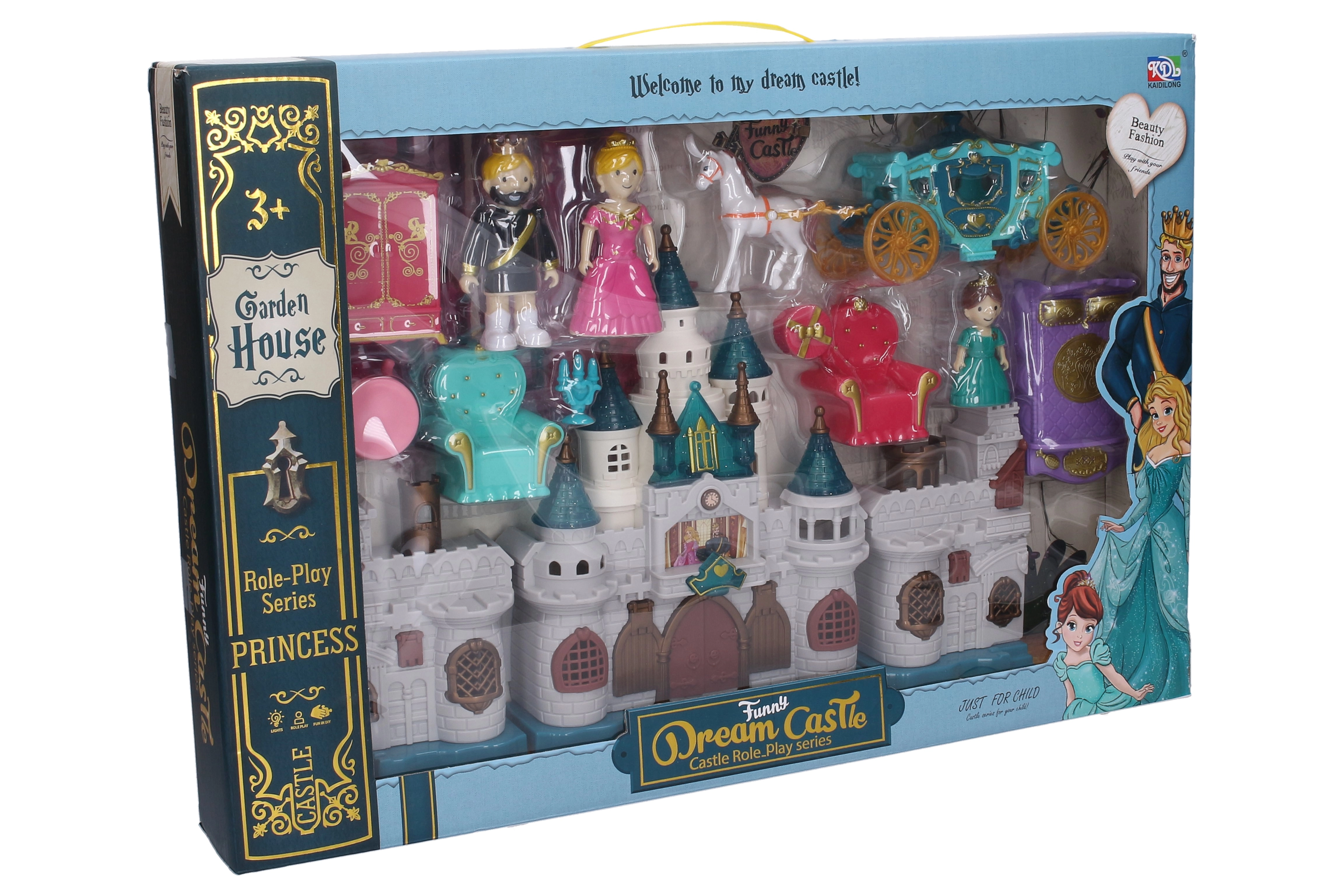 Součástí setu jsou 3 postavičky, stylový kočár s koněm a doplňkový nábytek, díky kterému lze vytvářet nespočet příběhů. Hrad je rozkládací, snadno se přenáší a je připraven k okamžité hře – baterie jsou již v balení.