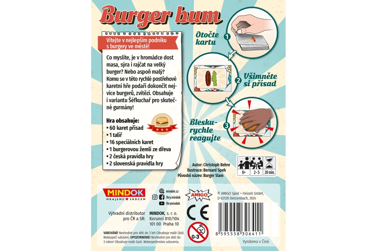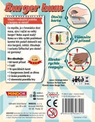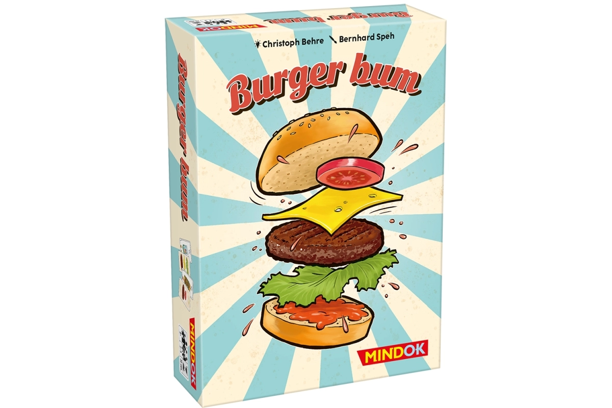 Burger Bum je svižná rodinná karetní hra, ve které skládáte chutné burgery z karet ingrediencí. Vítězí ten, kdo má na konci hry nejvíce karet v balíčku – klíčem je rychlá reakce, pozornost a správné načasování, kdy je burger hotový.