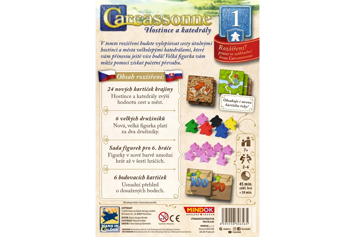 Rozšiřte svou základní hru Carcassonne o dynamické rozšíření Hostince a katedrály, které přináší nové strategické možnosti a vyšší bodové zisky. Stavte hostince na cestách a katedrály ve městech pro výrazné navýšení bodů, využijte velkého družiníka pro početní převahu a užijte si hru až v 6 hráčích. Ideální pro rodiny i strategické nadšence, věk 7+.
