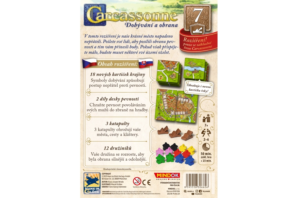 Rozšiřte svou oblíbenou hru CARCASSONNE o napínavé rozšíření Dobývání a obrana. Braňte město před útoky, vysílejte své následovníky na hradby a získejte nové bodové příležitosti. Nové kartičky se symboly dobývání spouští útoky na hradby a zvyšují strategickou hloubku hry. Pro 2–6 hráčů, od 7 let.