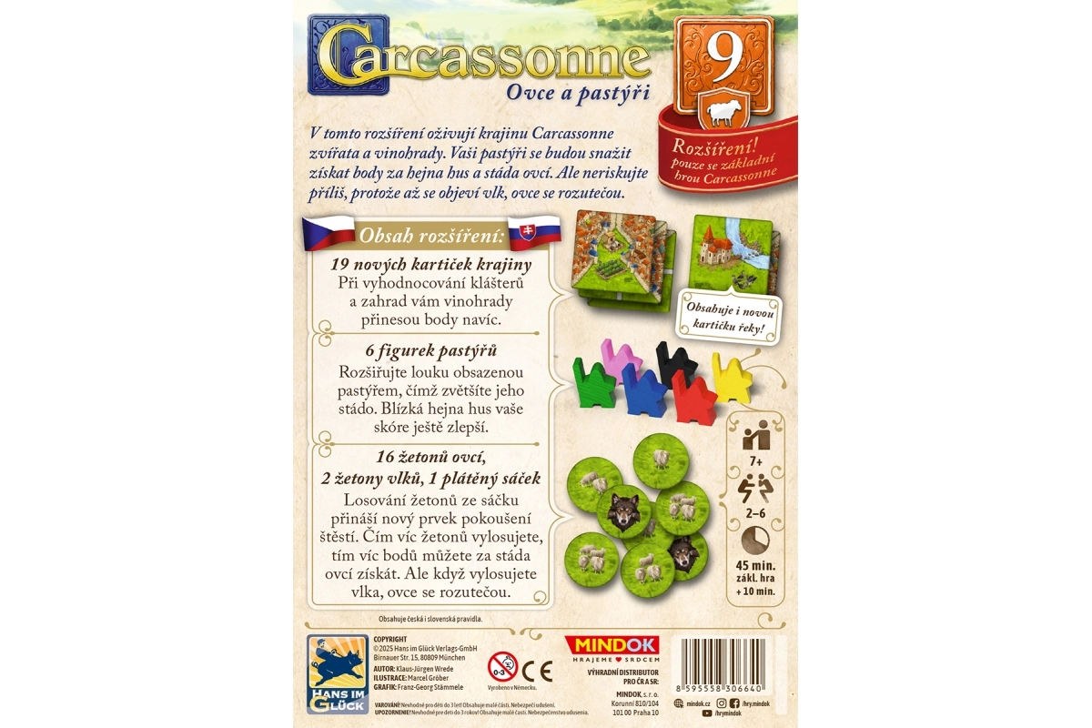 Oživte svou hru CARCASSONNE rozšířením Ovce a pastýři. Přidejte do svých herních strategií pastýře, sbírejte ovce na loukách, získejte bonusové body za husy a využijte vinohrady pro bodování s kláštery a zahradami. Pozor na vlka, který může vaše stádo rozehnat! Pro 2–6 hráčů, věk 7+.