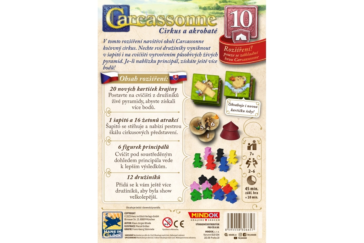 Kočovný cirkus přijíždí do světa Carcassonne. Toto rozšíření přináší tři snadno kombinovatelné moduly, které obohatí každou partii o nové strategie, napětí a způsob bodování. Stavte krajinu, plánujte umístění šapitó a získejte více bodů díky chytrému načasování.