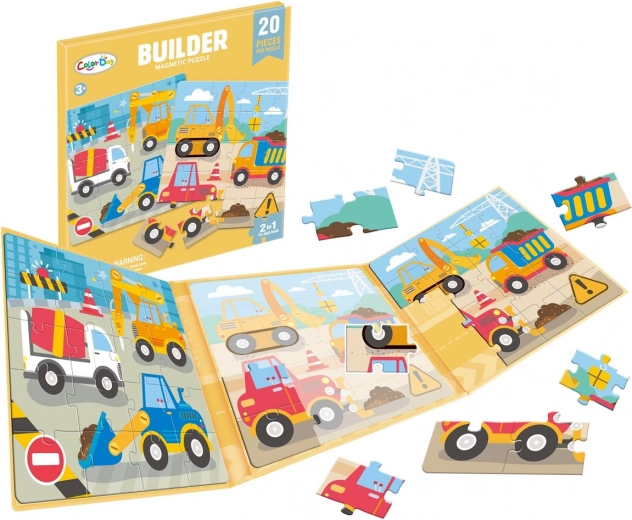 Barevná magnetická knížka s puzzli na téma stavebních strojů pro děti od 3 let nabízí 2 magnetické strany a možnost složit 2 obrázky po 20 dílcích. Díly drží pevně, takže si děti mohou hrát i na cestách v kočárku či autě. Živé barvy podporují rozvoj jemné motoriky, soustředění a fantazie.