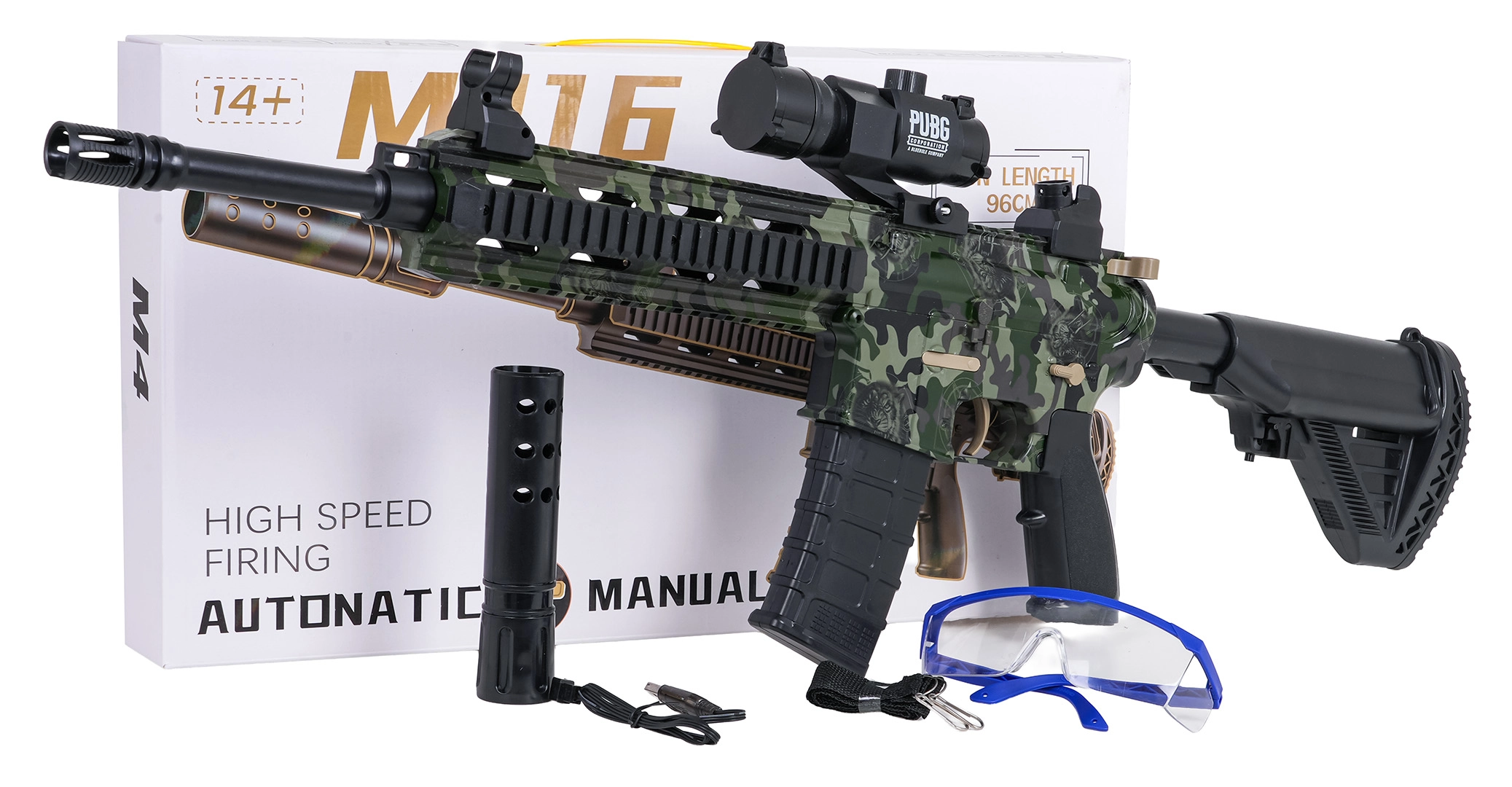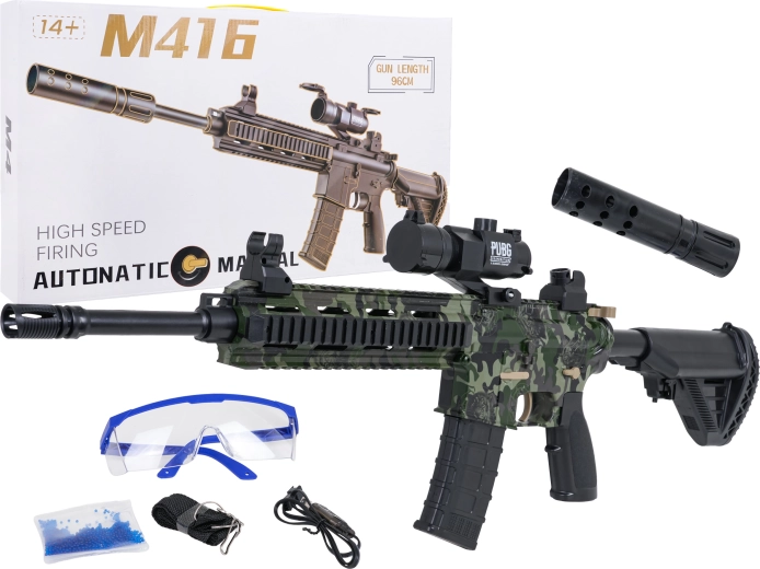 - Blaster M416, zásobník, tlumič, zaměřovač, USB kabel, akumulátor 7,4 V, sáček s cca 500 ks kuliček k přípravě, popruh, ochranné brýle, návod