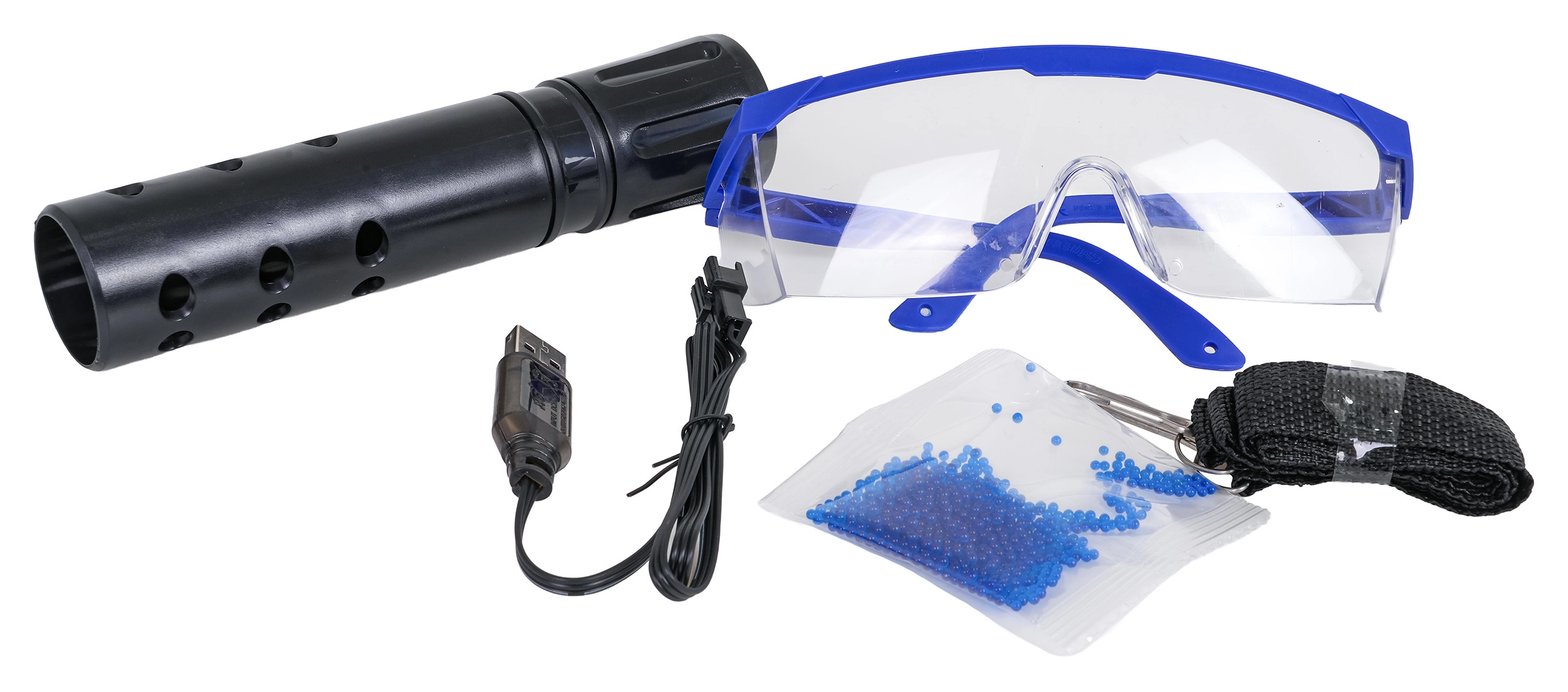 - Kompletní set příslušenství: zásobník, tlumič, popruh, ochranné brýle a nabíjecí kabel.