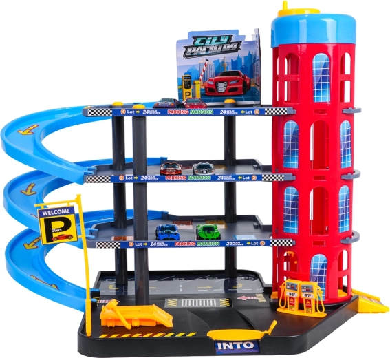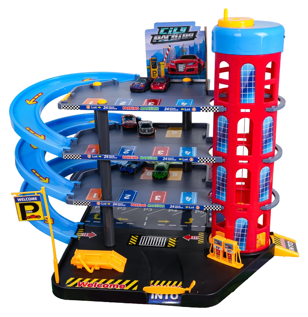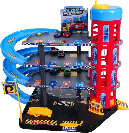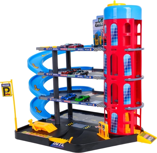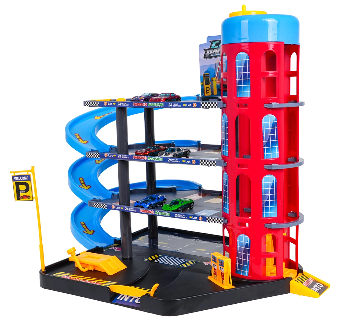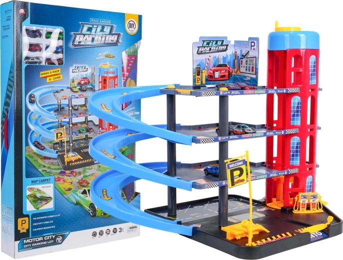 Toto barevné vícepatrové parkoviště kombinuje realistické prvky města s dynamickou jízdou. Děti mohou autíčka vyvážet ručně ovládaným výtahem, parkovat na jednotlivých patrech a spouštět je po spirálových rampách. Integrovaná čerpací stanice, servisní zvedák a závorový vjezd podporují imaginativní hru.