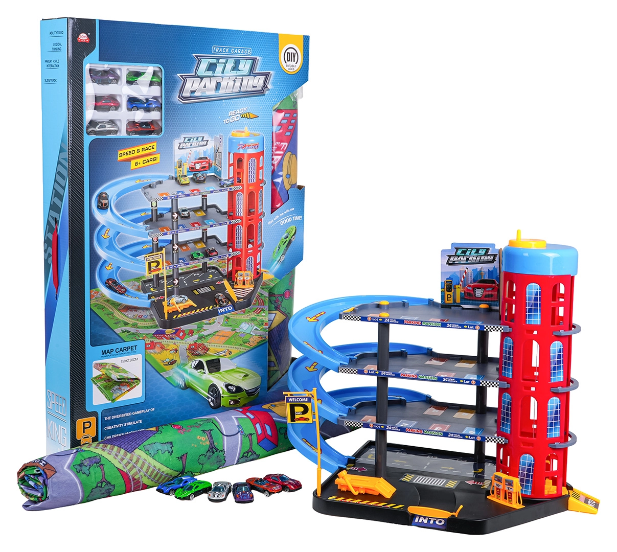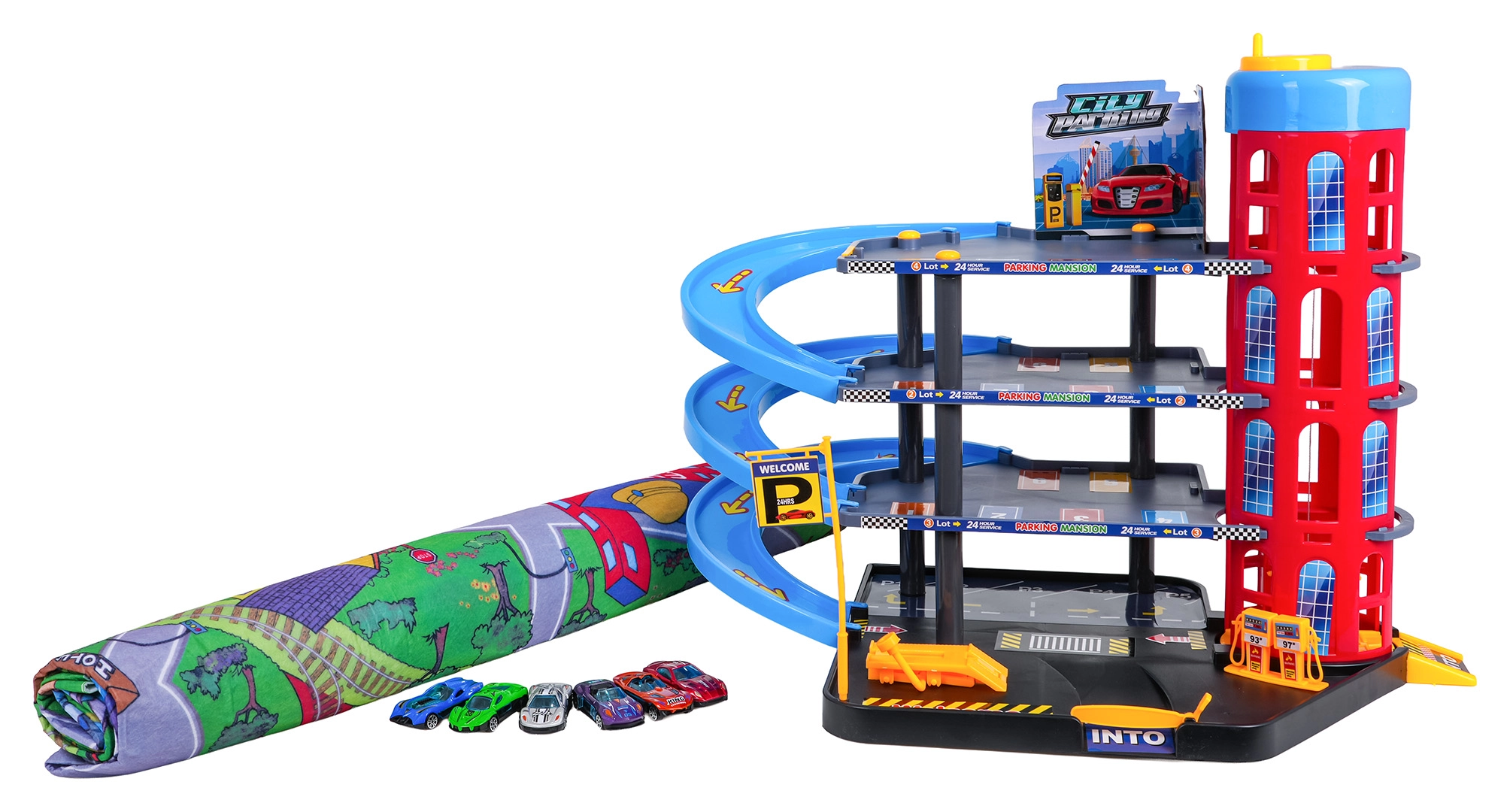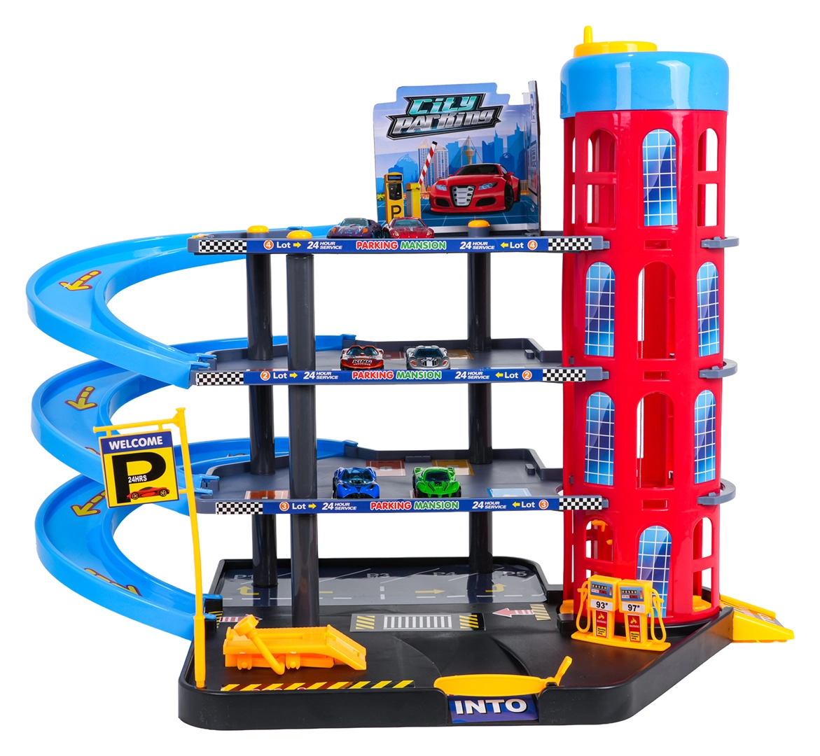 Toto barevné vícepatrové parkoviště kombinuje realistické prvky města s dynamickou jízdou. Děti mohou autíčka vyvážet ručně ovládaným výtahem, parkovat na jednotlivých patrech a spouštět je po spirálových rampách. Integrovaná čerpací stanice, servisní zvedák a závorový vjezd podporují imaginativní hru.