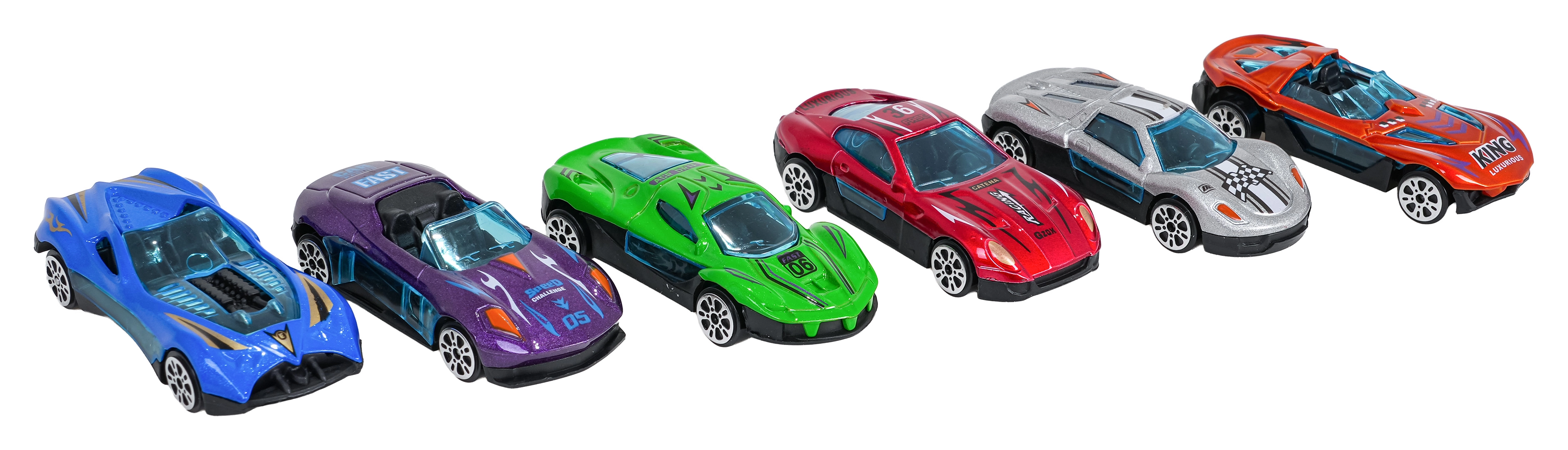 Okamžitě připraveno ke hře: šest odolných aut s kovovou karoserií, hladkým chodem kol a sportovními potisky pro nekonečné závody.