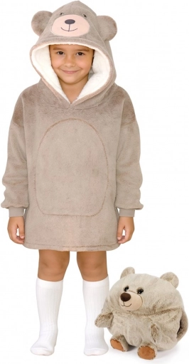Roztomilá a praktická mikinová deka s kapucí ve stylu medvídka pro děti 3–6 let. Nabízí super měkký sherpa fleece uvnitř, hebkou flanelovou vnější vrstvu, oversize střih pro maximální pohodlí a velkou přední kapsu na zahřátí rukou. Ideální na gaučink, hraní i stanování v chladnějším počasí.