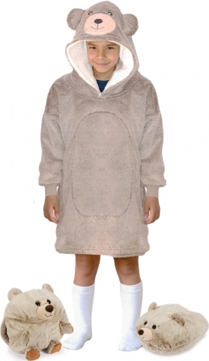 Praktické detaily potěší: velká medvědí kapuce s oušky, obří klokaní kapsa pro zahřátí rukou a místo na drobnosti, odolné materiály a snadná údržba – stačí vyprat na 30 °C. Skvěle se hodí i na venkovní posezení, stanování nebo do chladnějších místností.