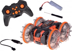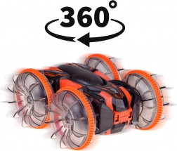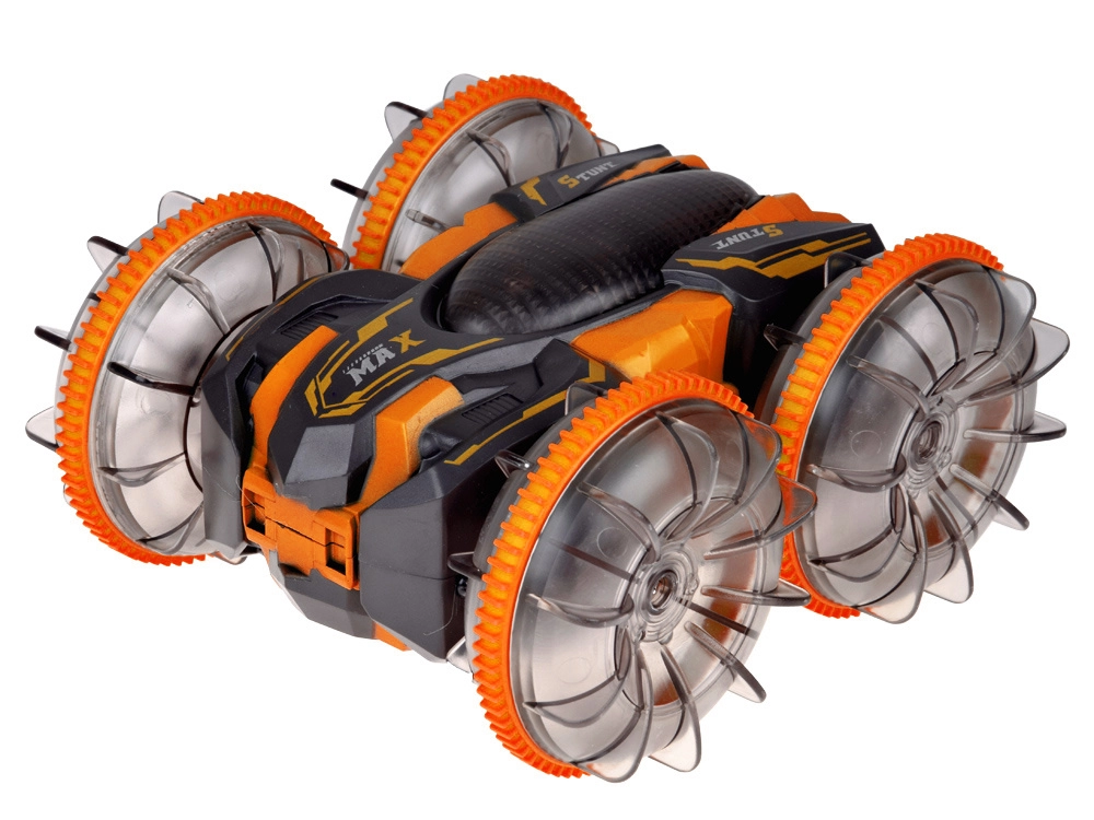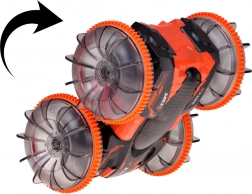 Objevte akční jízdu s amfibiálním kaskadérským RC autem, které si poradí s trávou, pískem, dlažbou i vodní hladinou. Velká průhledná kola s výrazným vzorkem a LED osvětlením dodají každé jízdě show efekt a jistotu přilnavosti. Díky otočkám o 360° auto pokračuje v jízdě i po převrácení na druhou stranu.