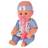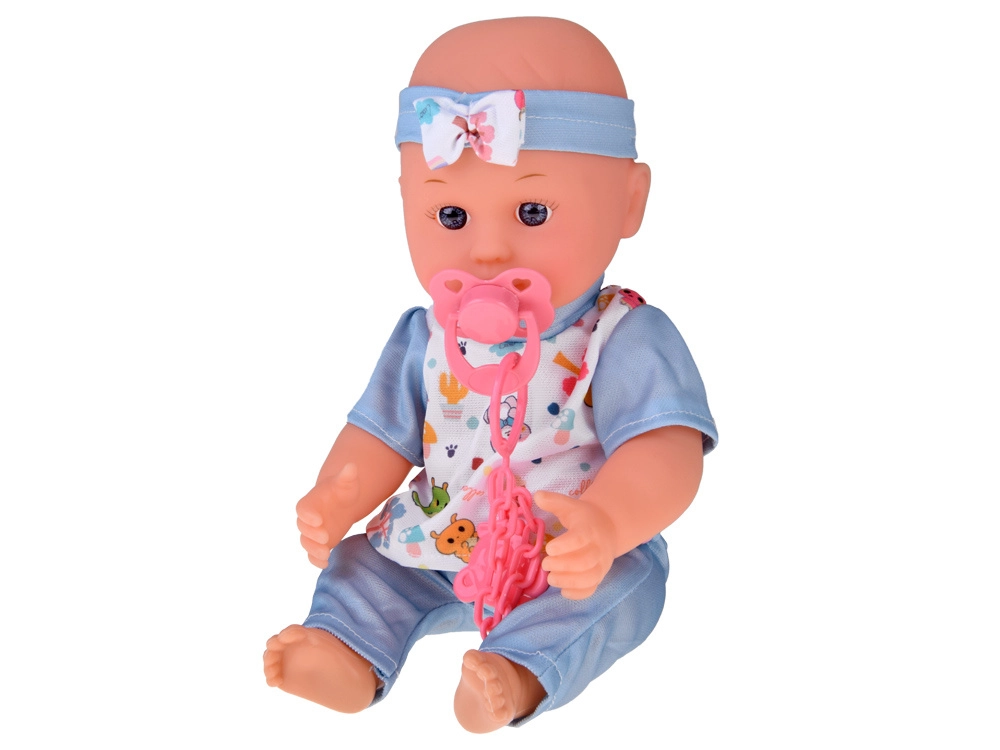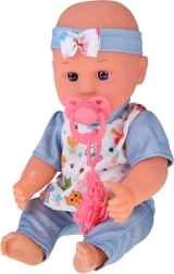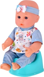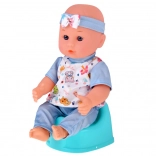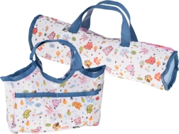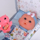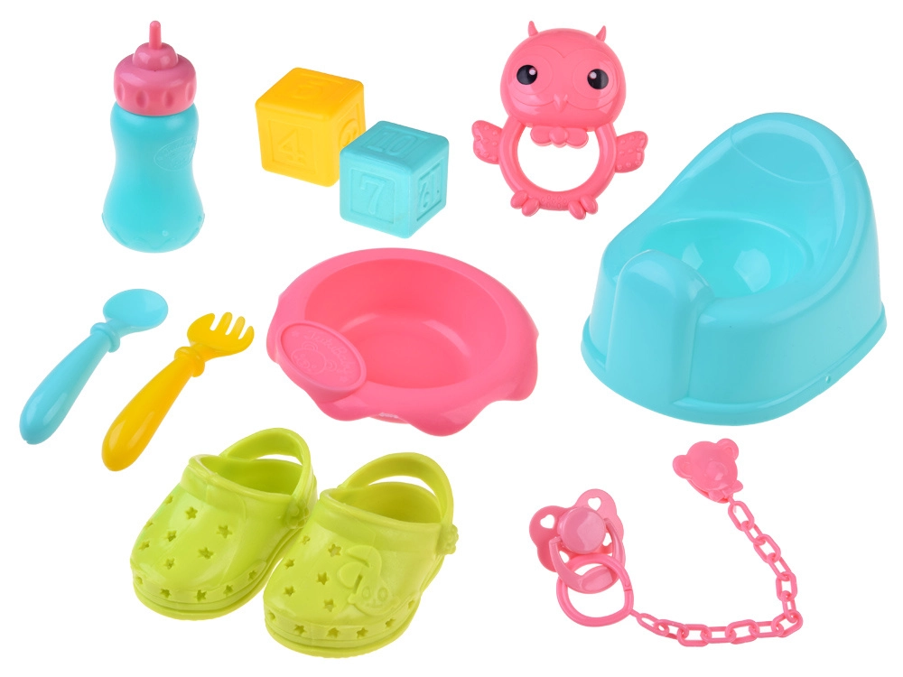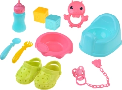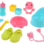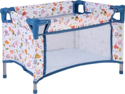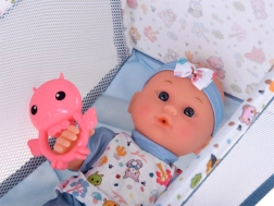 Praktická výbava zahrnuje jídelní set (misku, příbory a lahvičku), nočník, dudlík s řetízkem, barevné kostičky a chrastítko. Cestovní postýlka s prodyšnými síťovanými boky a taškou je ideální na hraní i skladování. Díky bohatému příslušenství děti snadno napodobí skutečnou péči o miminko a rozvíjí komunikaci i jemnou motoriku.