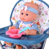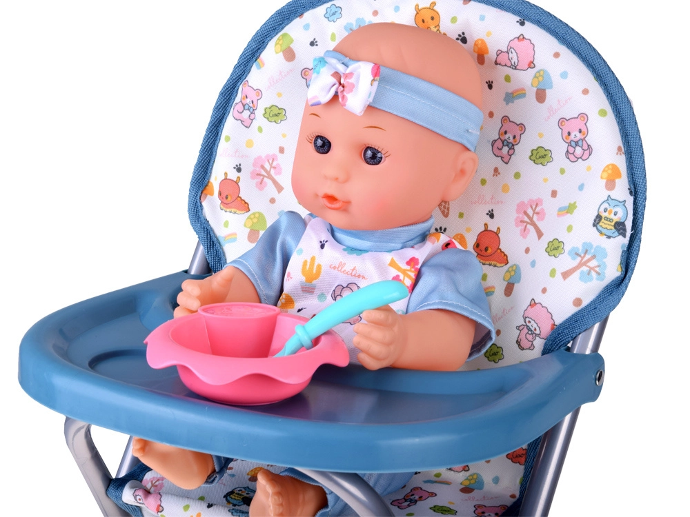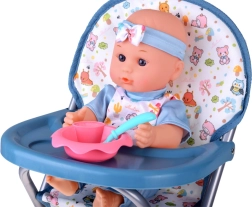 Stabilní rozkládací židlička s tácem a místem pro misku a příbory. Podporuje realistickou hru krmení a stolování s panenkou.