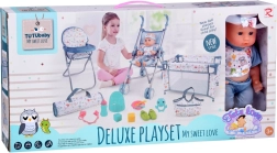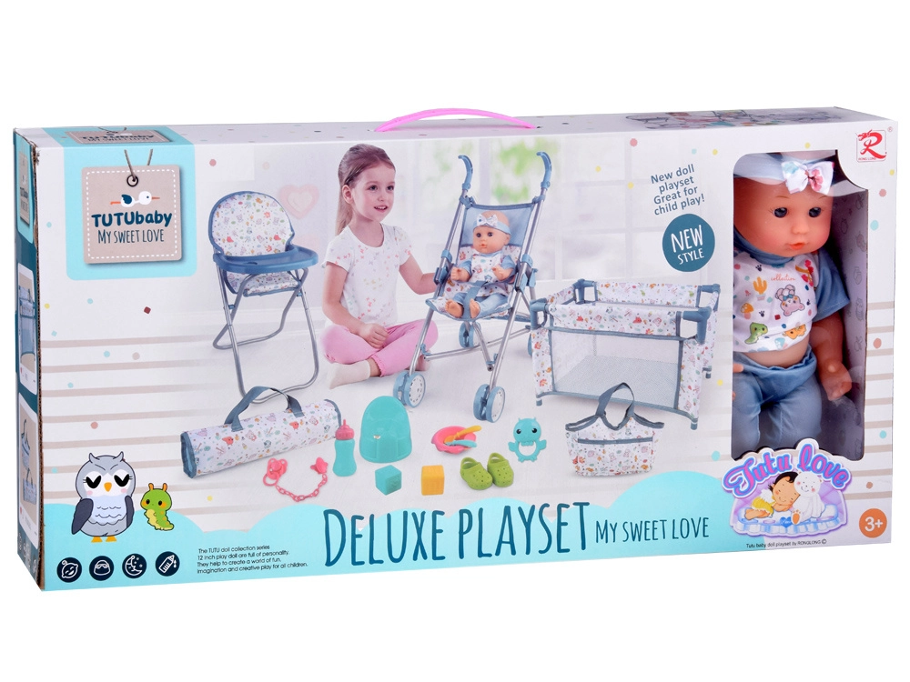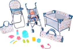 Kompletní herní set pro malé pečovatele: roztomilá panenka miminko s bohatou výbavou pro krmení, přebalování, spaní i procházky. Součástí je skládací kočárek, jídelní židlička, cestovní postýlka s taškou, nočník, láhev, miska se lžičkou a vidličkou, dudlík na řetízku, hračky a botičky. Tento set rozvíjí empatii, kreativitu a role-play dovednosti a nabízí hodiny zábavy doma i na cestách.
