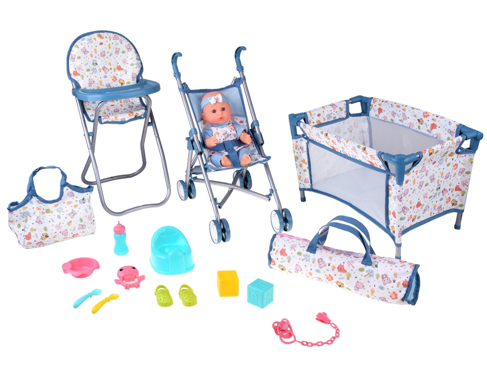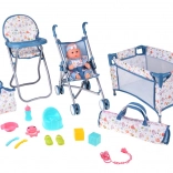 - Sada pro panenku – panenka miminko s kočárkem, postýlkou, židličkou a doplňky