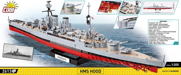 Model HMS HOOD měří 88 cm na délku a 22 cm na výšku, takže vynikne na každé polici či pracovním stole. Věrné proporce v měřítku 1:300 podtrhují jeho sběratelskou hodnotu.