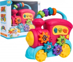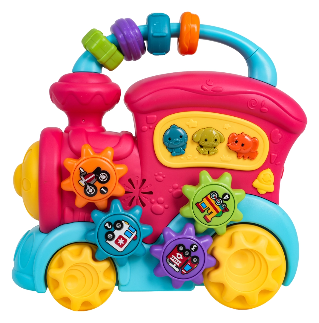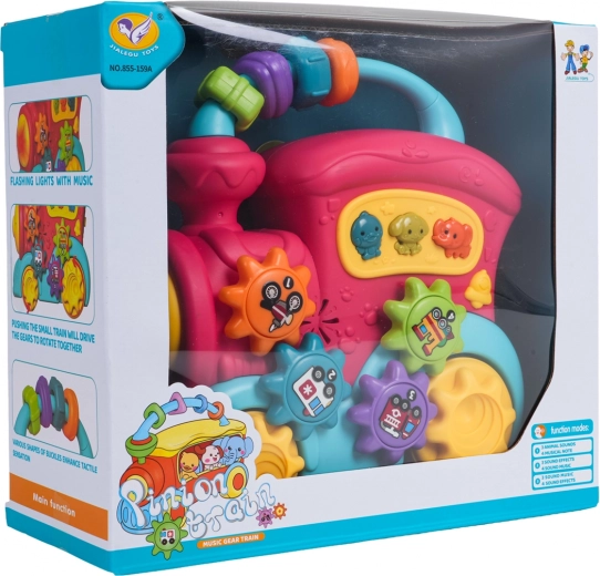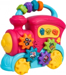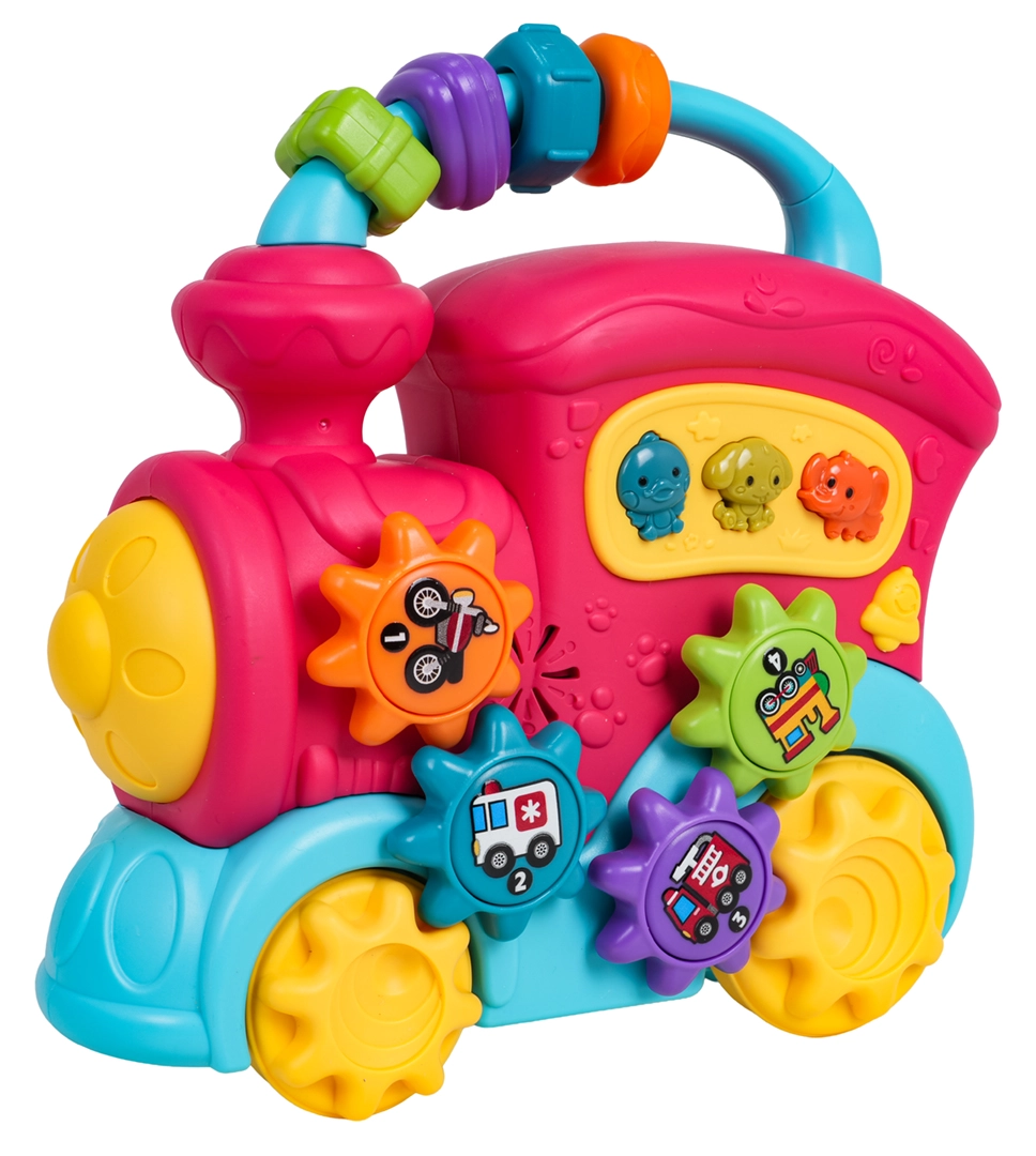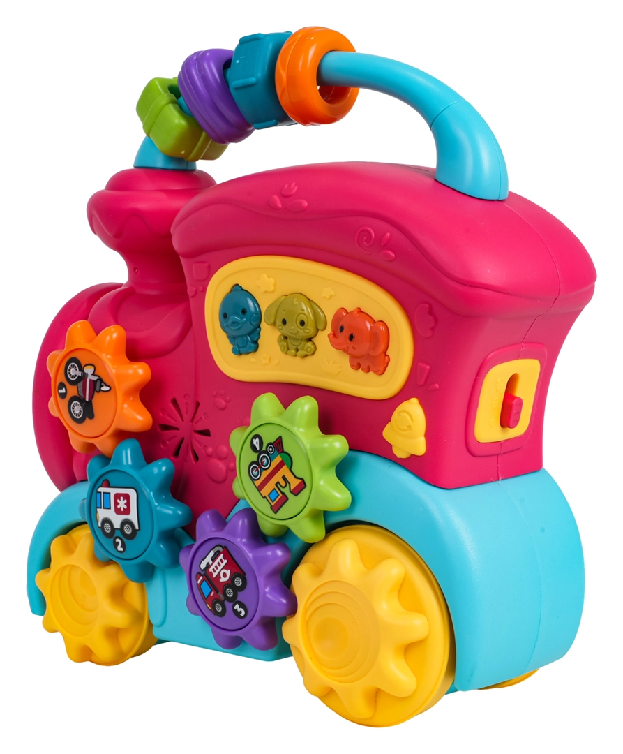 Tento barevný vláček z kvalitního plastu potěší malé objevitele množstvím interaktivních prvků. Na střeše najdete sensorické korálky, na boku ozubená kolečka s obrázky a tlačítka se zvířátky, která po stisknutí přehrají zvuky kachny, psa či slona, veselé zvonky i melodie. Při posunu vláčku se roztočí kola a ozubený mechanismus vydává příjemné chrastění, přední světlomet se rozsvítí a dítě je tak motivováno k dalšímu zkoumání.