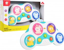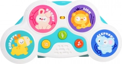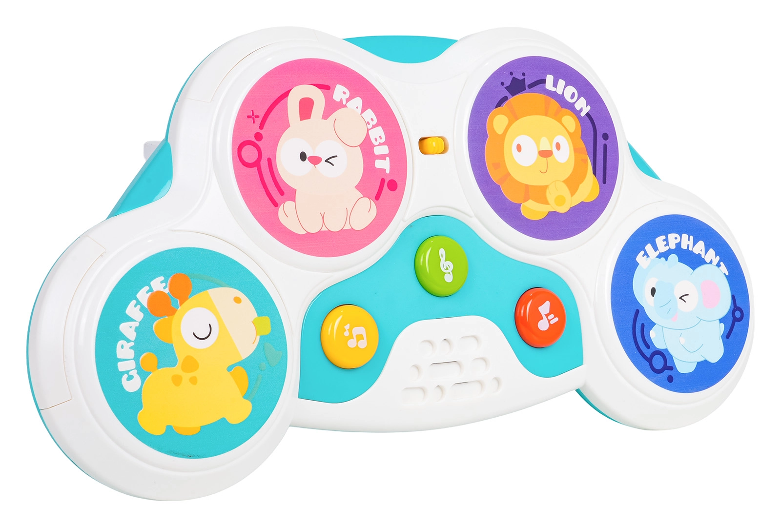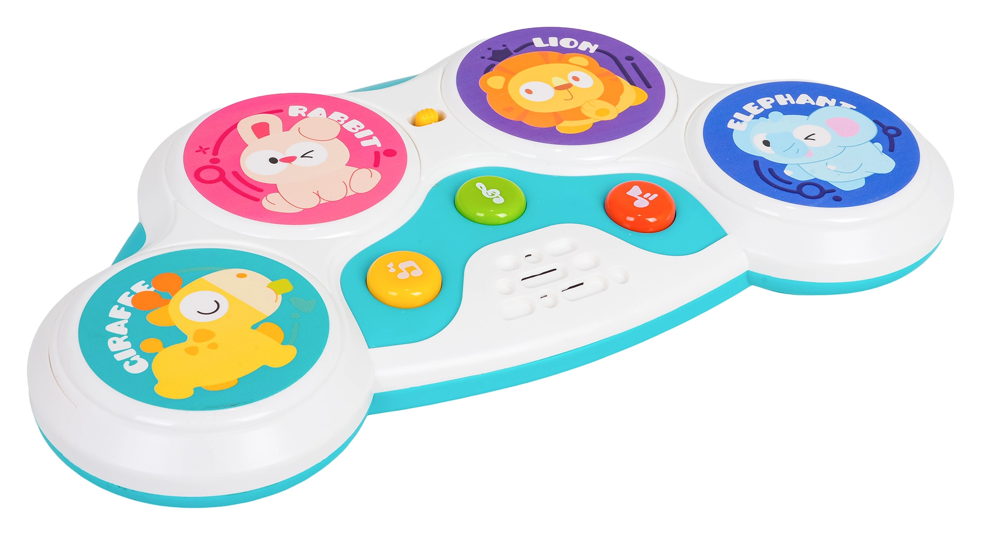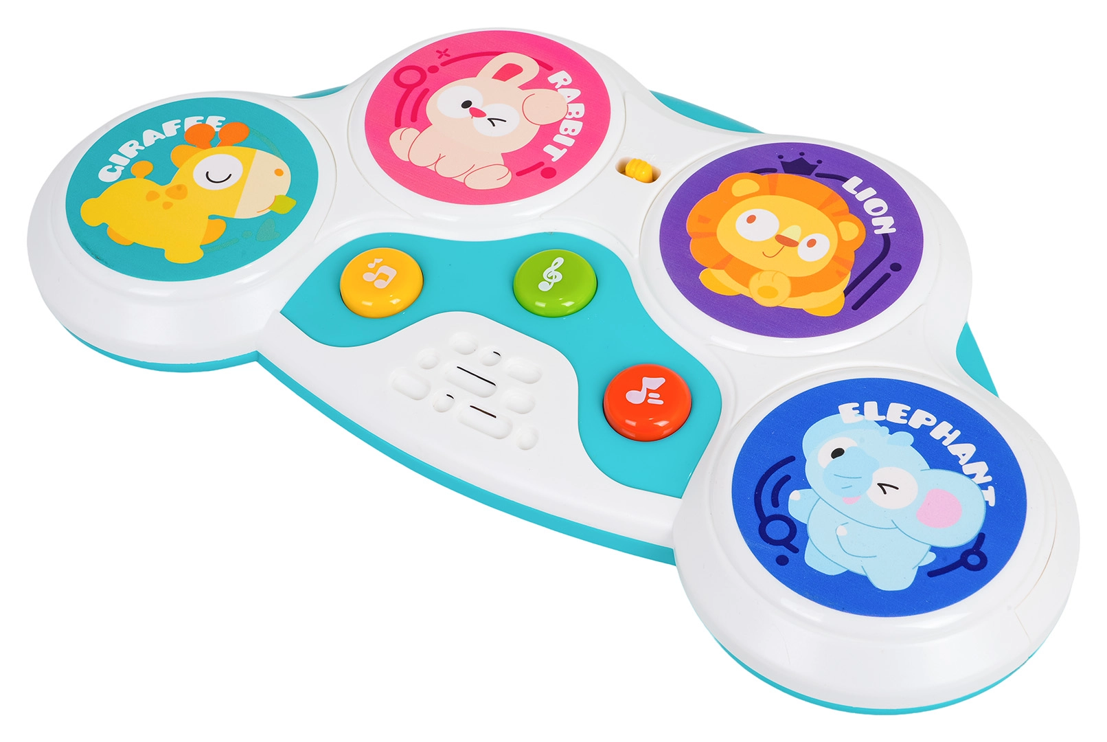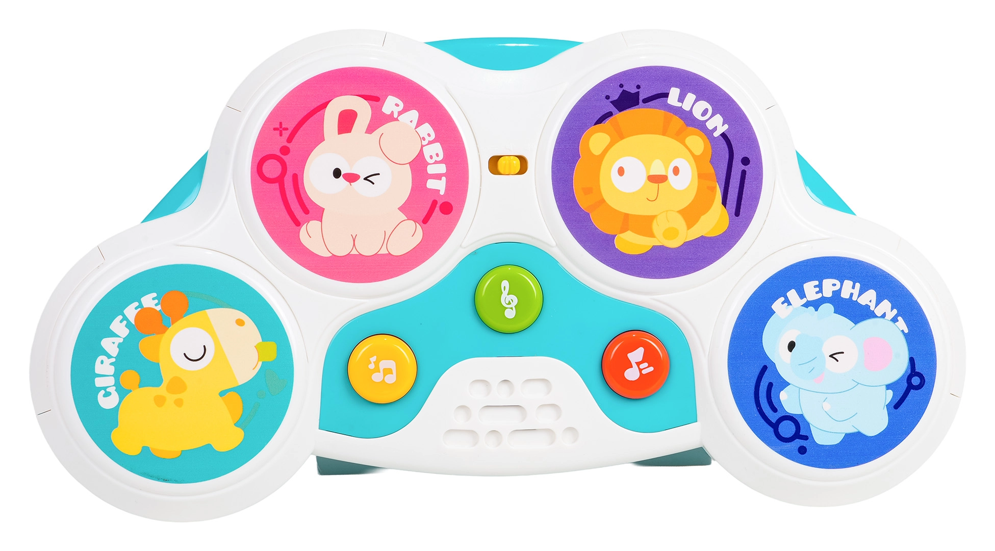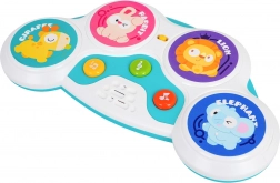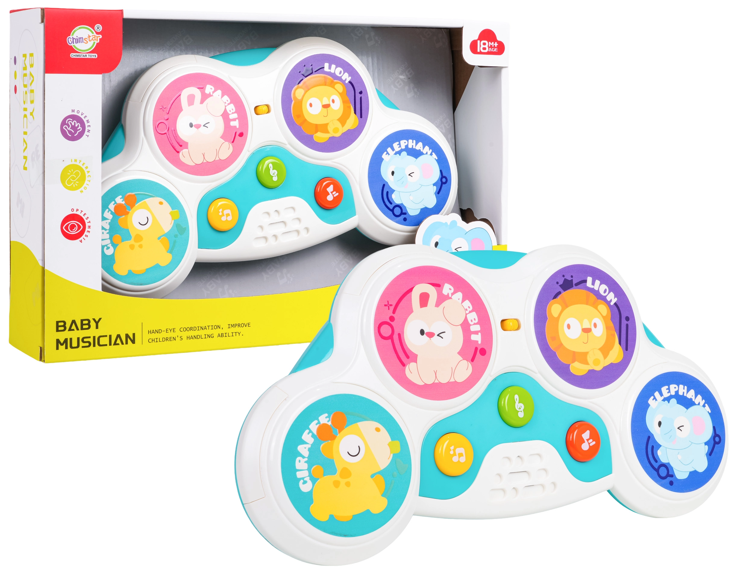 Čtyři barevné plochy s motivy králíka, lva, žirafy a slona spouštějí zvířecí zvuky, melodie a bubnové rytmy – zábava na jedno ťuknutí.