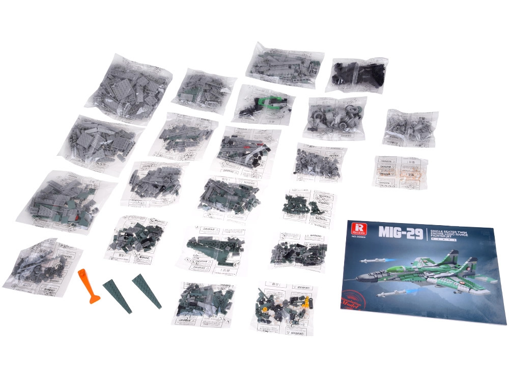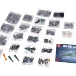 Balení obsahuje mnoho sáčků s dílky a přehledný návod MIG‑29. Stavba je plynulá a přehledná od začátku do konce.