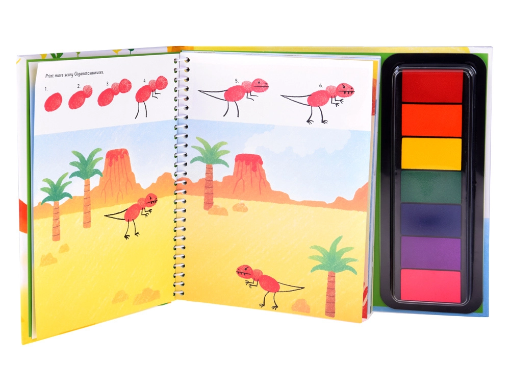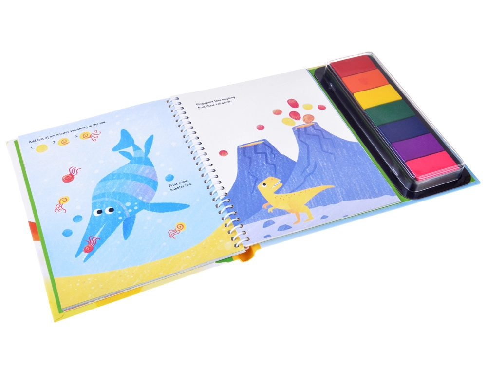 Integrovaná paletka se 7 zářivými barvami a měkkými polštářky usnadňuje otiskování bez nepořádku. Stačí namočit prst a tvořit.