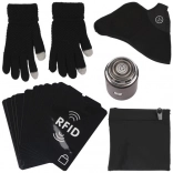 vánoční kravata, ponožky, čepice Santa, třpytivý motýlek, domino, svinovací metr, pokerové doplňky, věšák, držák na brýle, dotykové rukavice, zimní maska, sportovní pás s kapsou, pouzdro na karty, holicí strojek, USB‑C větráček, držák telefonu, bezpečnostní kladívko 3v1, čelovka, stojánek na telefon, nůž s vysouvací čepelí, nabíjecí set, nerezové panáky, sada knírků, měrky hloubky dezénu
