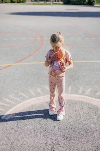 Boční zapínání a pevná přední kapsa udrží panenku stabilně na místě i během pohybu.