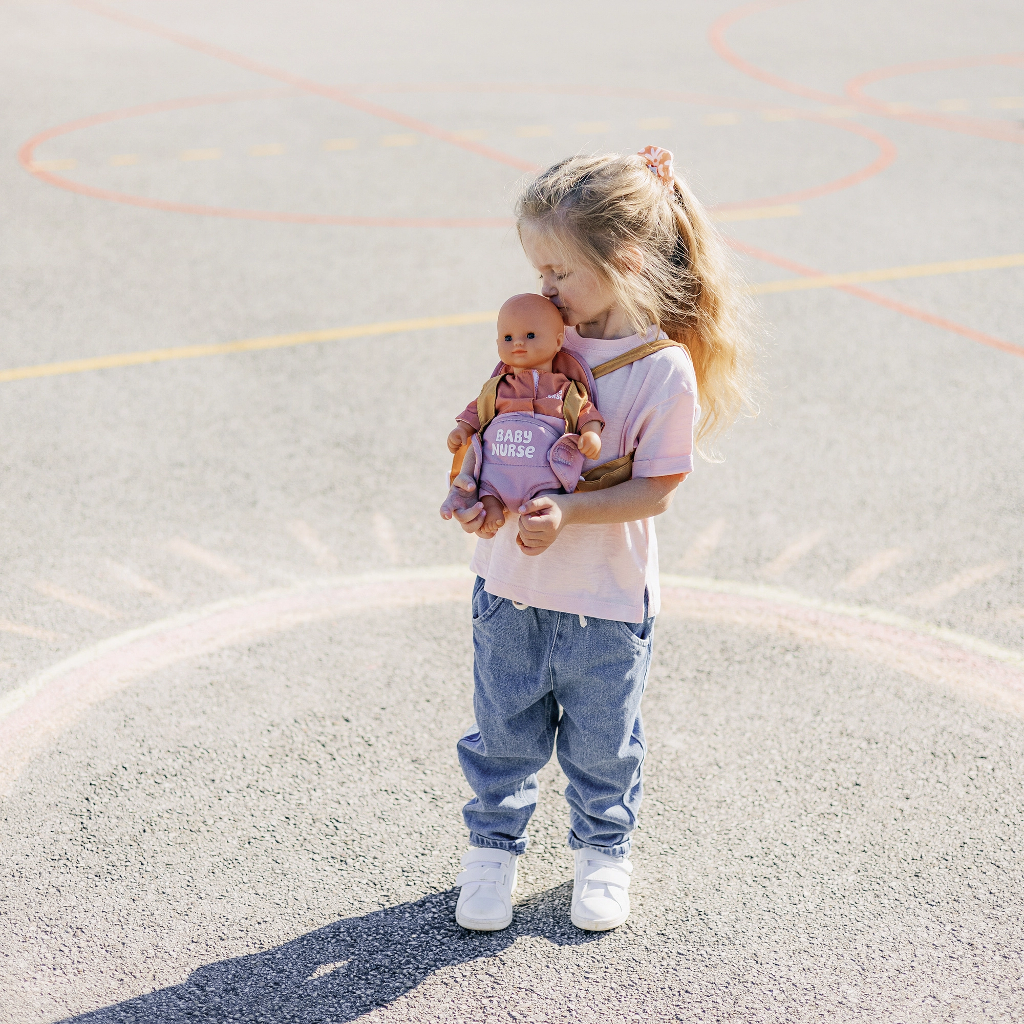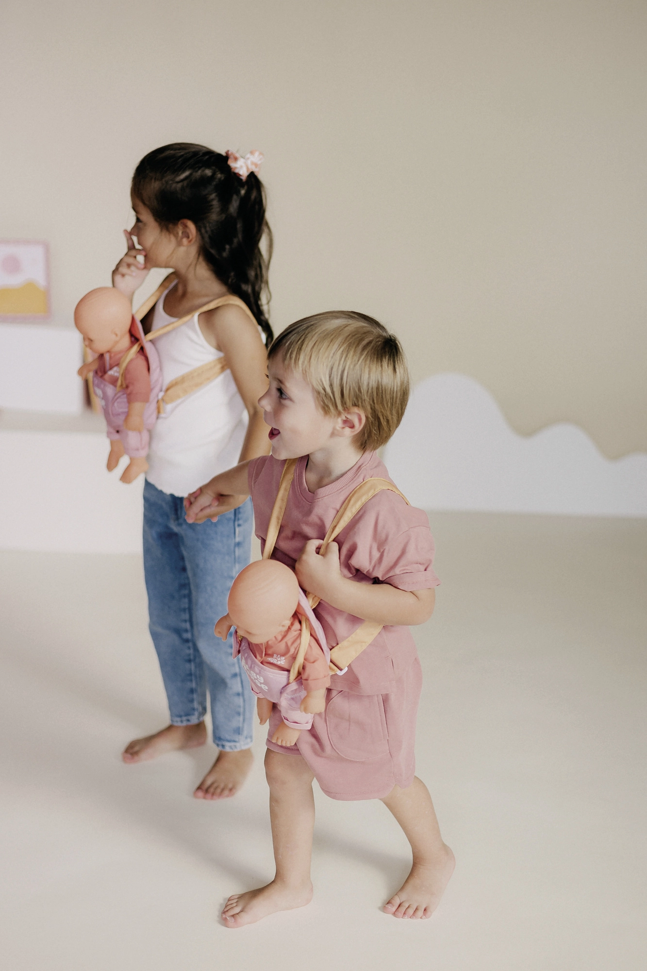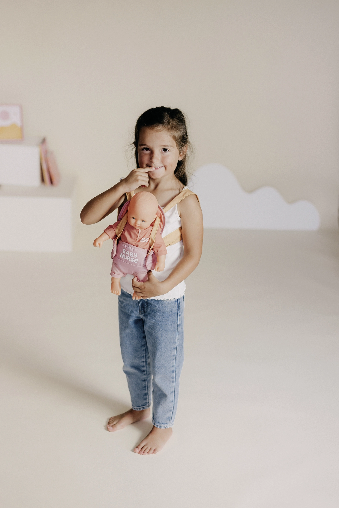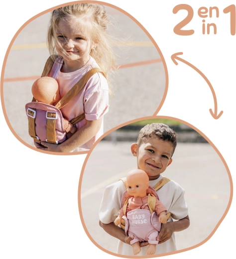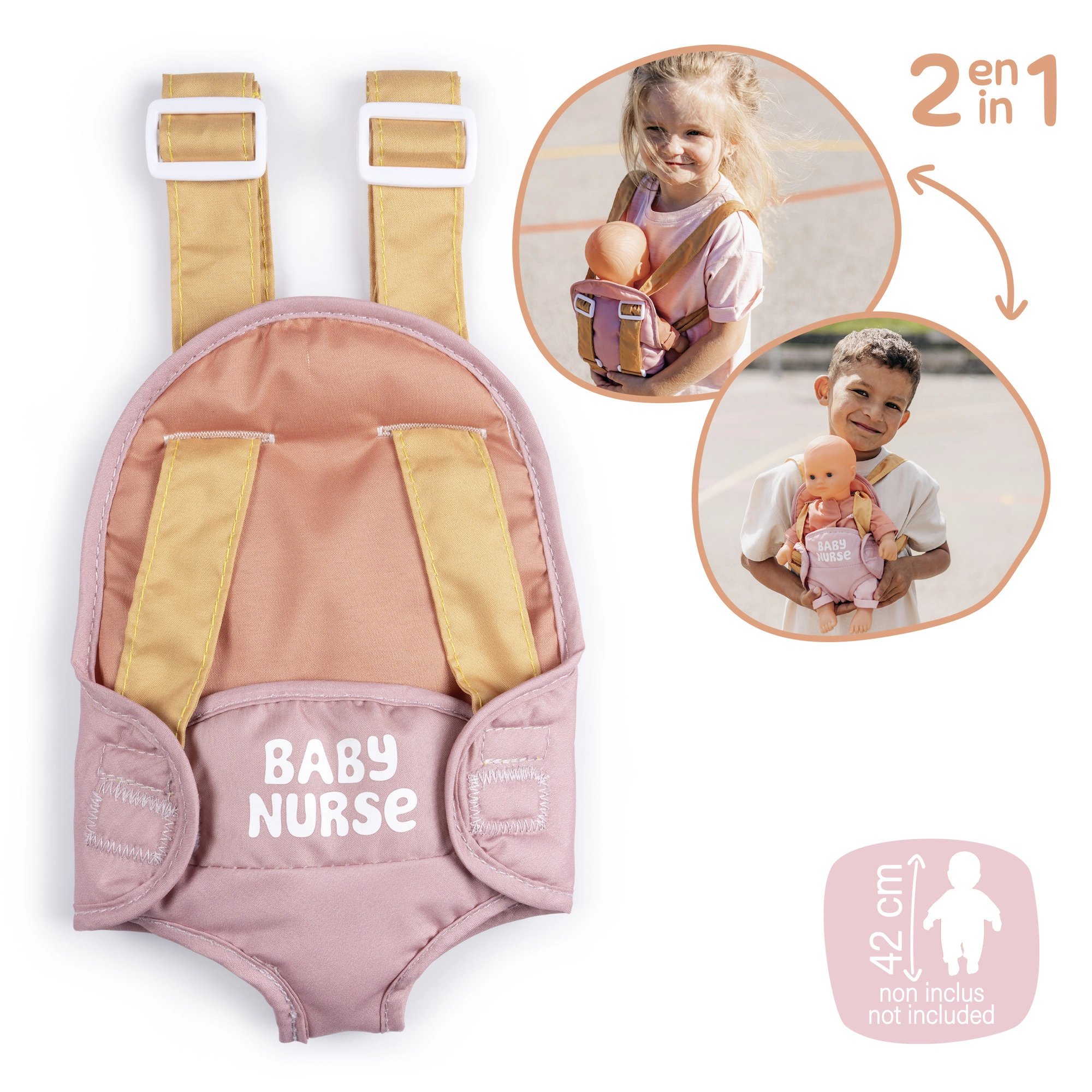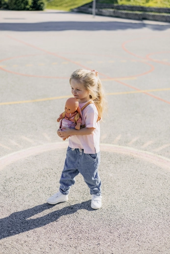 Nosítko se snadno přizpůsobí postavě dítěte díky nastavitelným popruhům. Pastelová kombinace růžové a okrové barvy působí něžně a moderně, takže perfektně doplní výbavu pro panenky BABY NURSE.