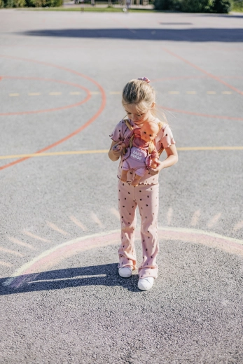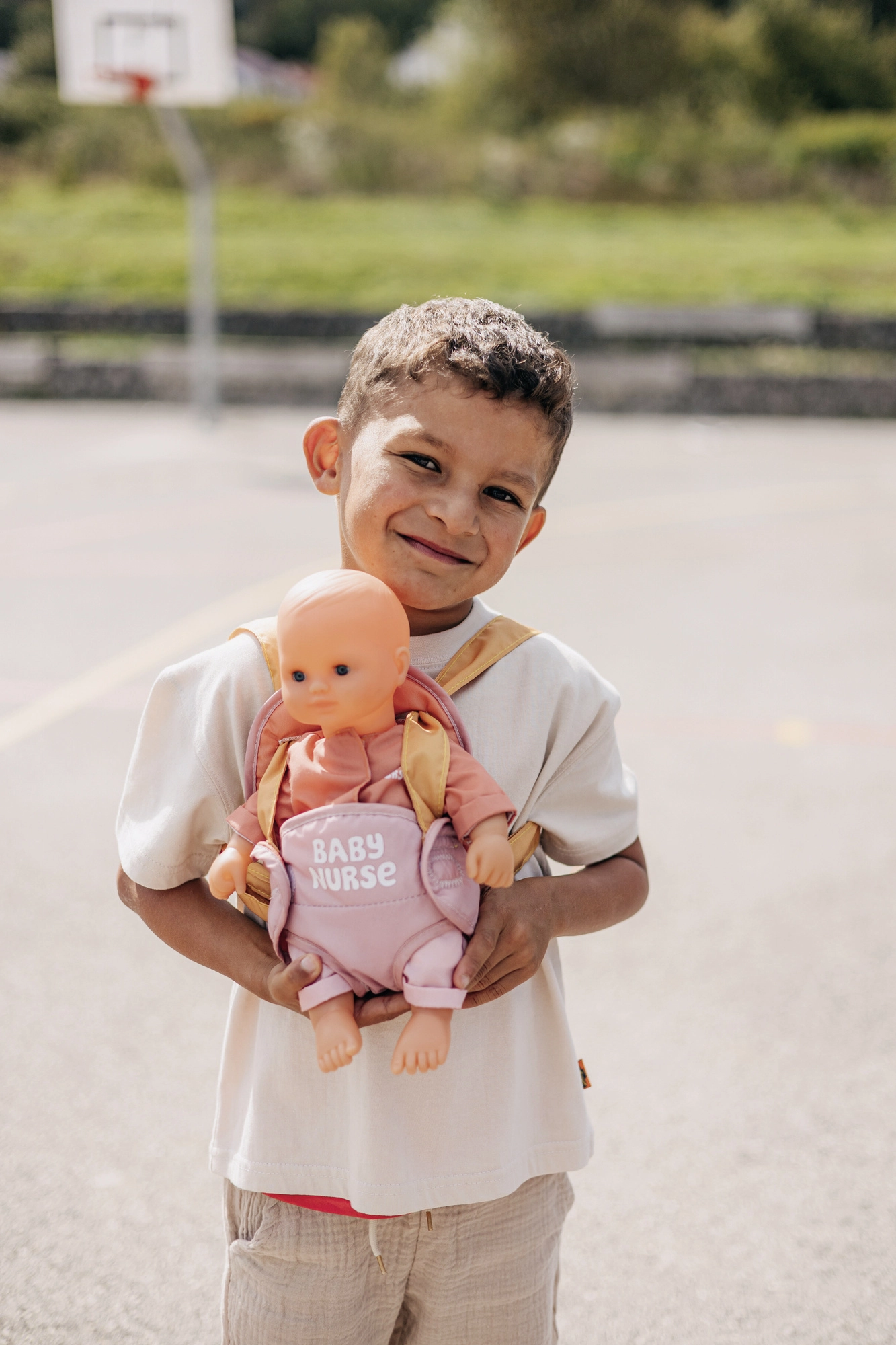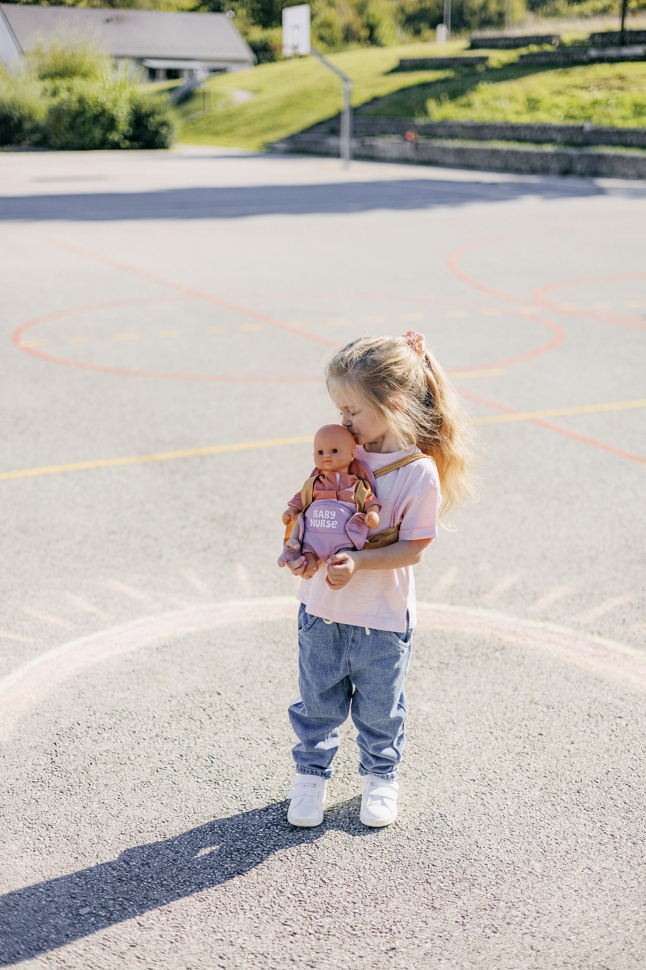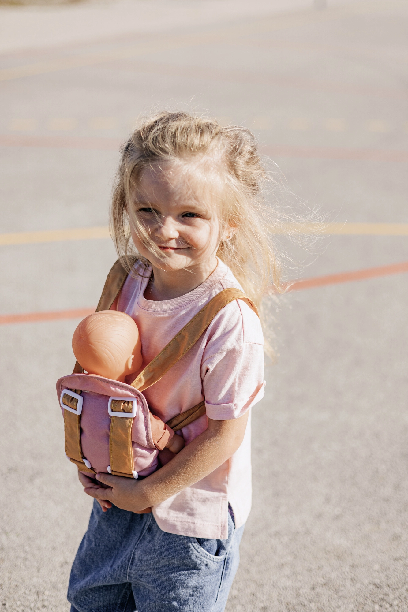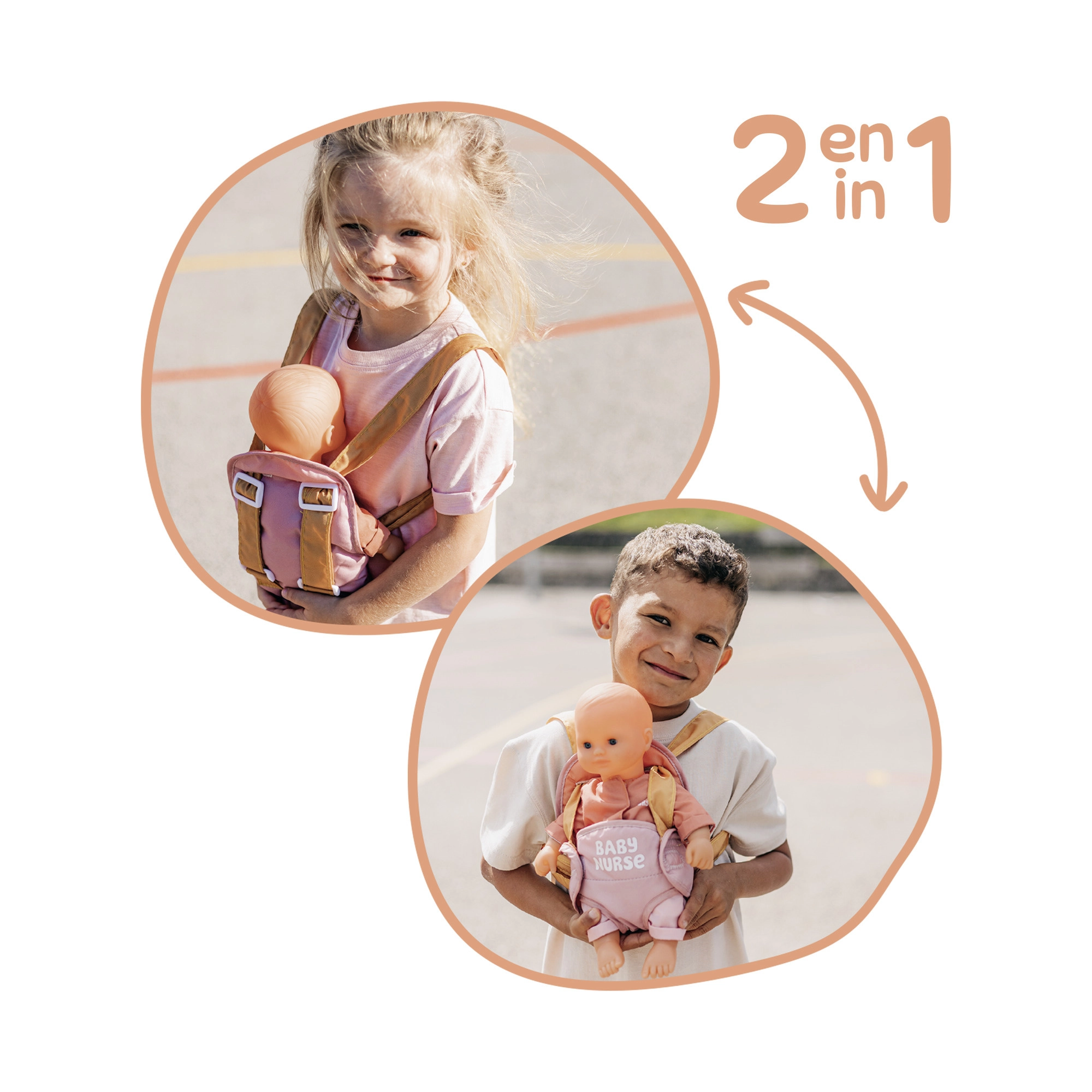 Nosítko se snadno přizpůsobí postavě dítěte díky nastavitelným popruhům. Pastelová kombinace růžové a okrové barvy působí něžně a moderně, takže perfektně doplní výbavu pro panenky BABY NURSE.