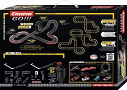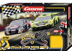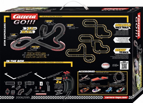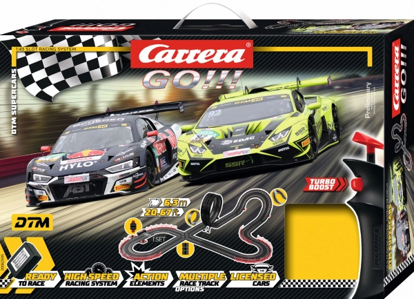 Zažijte napínavé závody s autodráhou CARRERA GO DTM Supercars dlouhou 6,3 m se skvělými modely Audi R8 LMS GT3 a Lamborghini Huracán GT3. Set nabízí klopené zatáčky, looping, křižovatku a mechanické počítadlo kol pro skutečnou závodní atmosféru. Díky turbo ovladačům, dvojitým kontaktním kartáčkům a magnetům auta skvěle drží na trati a poskytují rychlou a plynulou jízdu.