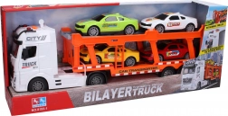 Velký auto tahač na setrvačník o délce 56 cm přiváží rovnou 4 stylová auta a postará se o spoustu zábavy díky světelným a zvukovým efektům. Aktivace probíhá pohodlně tlačítky na střeše, nechybí zvuk motoru, couvání i pohybu plošiny. Součástí jsou baterie, takže zábava může začít hned.