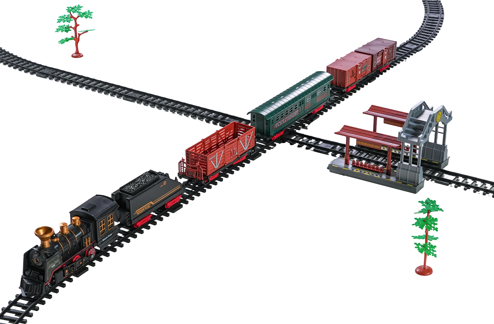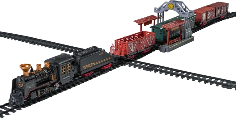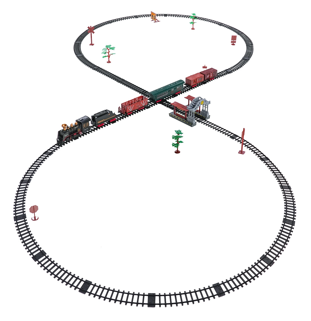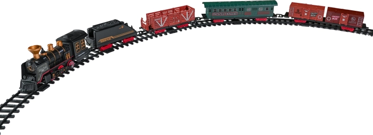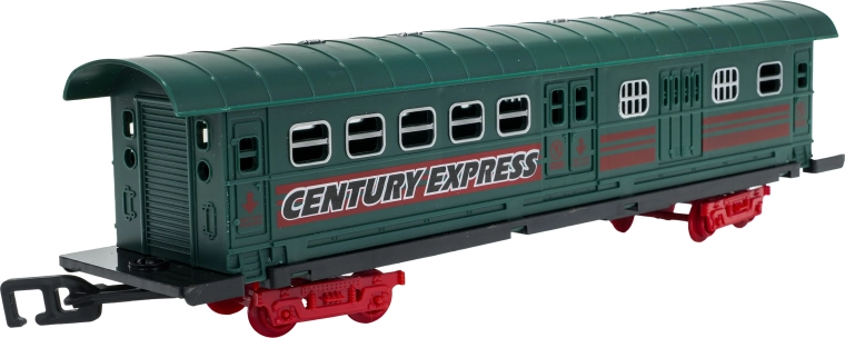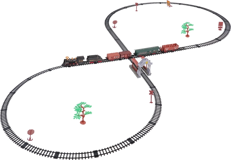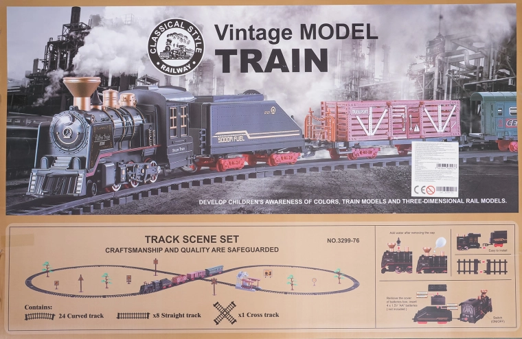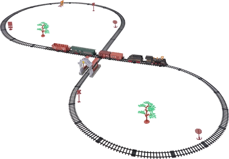 Součástí balení je kompletní vlaková souprava s lokomotivou, tendrem, osobním a nákladními vozy, sadou kolejí a tematickými doplňky jako stromky a značky. Set podporuje rozvoj fantazie, jemné motoriky i trpělivosti a je ideální jako dárek pro malé milovníky železnic.