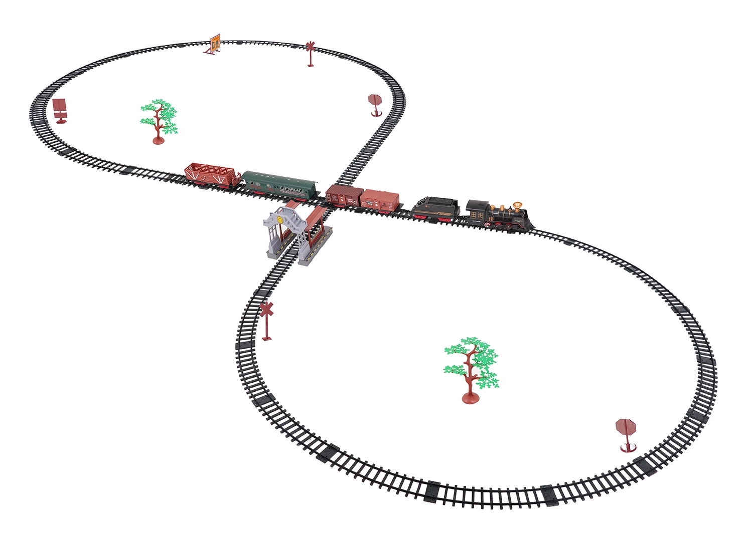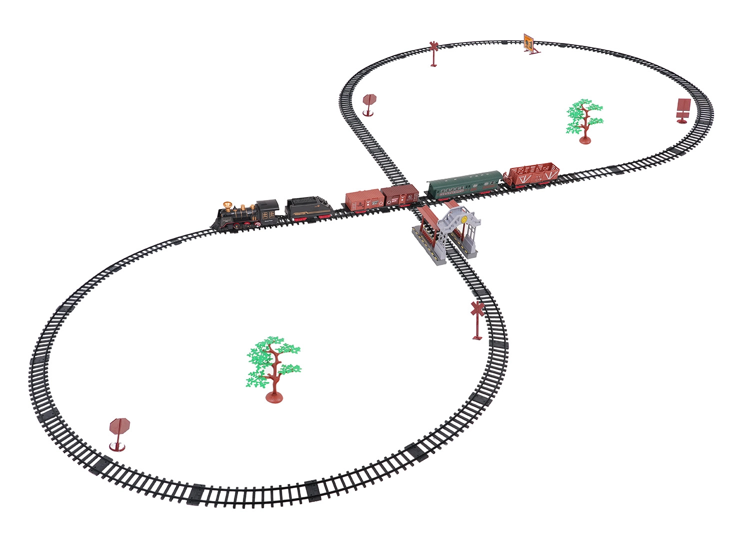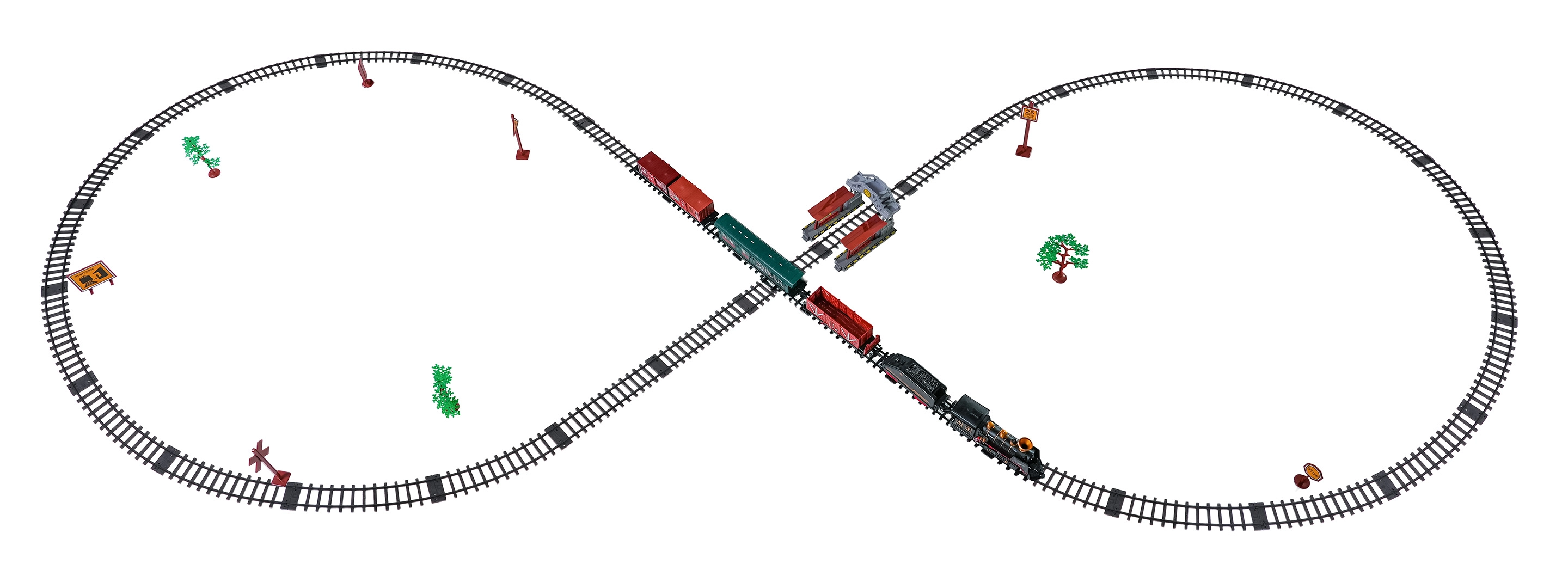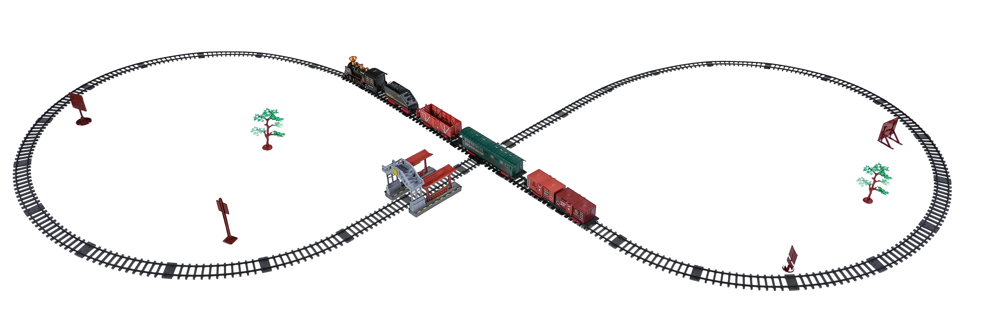 Součástí balení je kompletní vlaková souprava s lokomotivou, tendrem, osobním a nákladními vozy, sadou kolejí a tematickými doplňky jako stromky a značky. Set podporuje rozvoj fantazie, jemné motoriky i trpělivosti a je ideální jako dárek pro malé milovníky železnic.