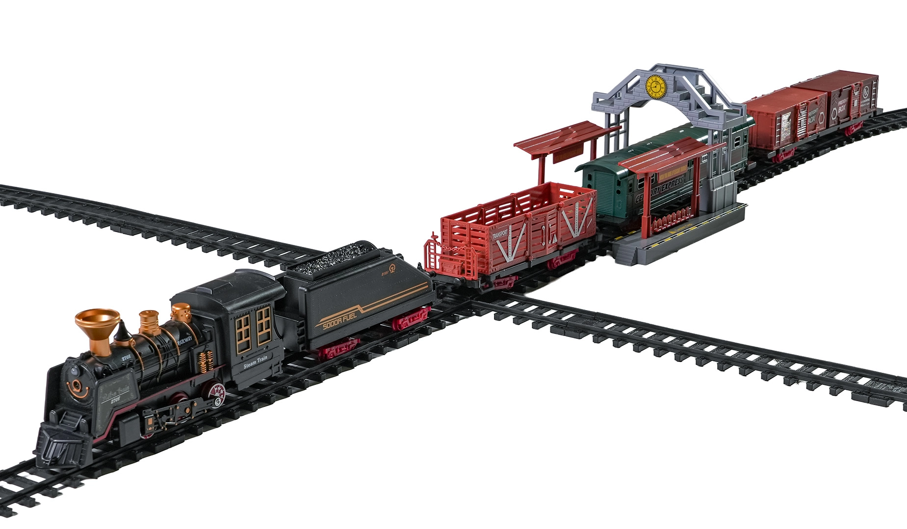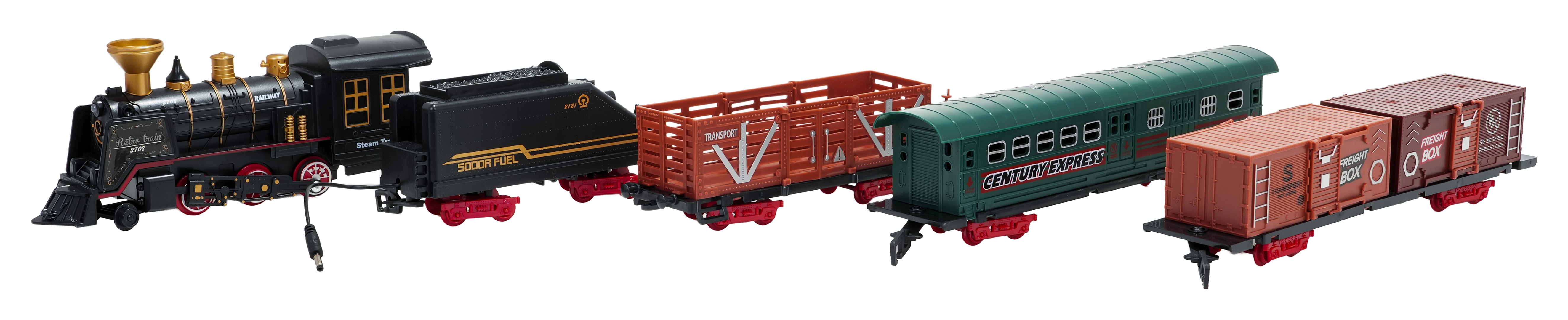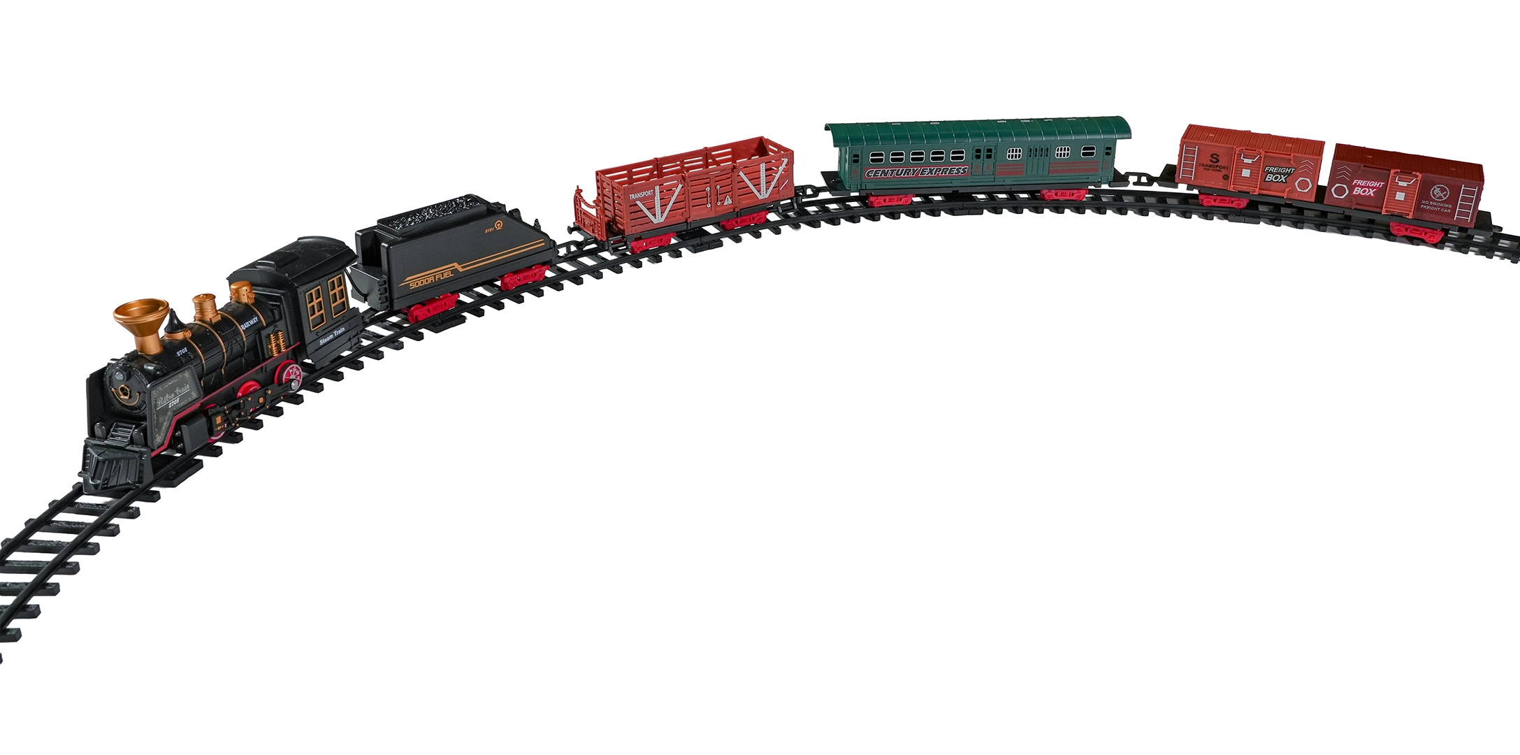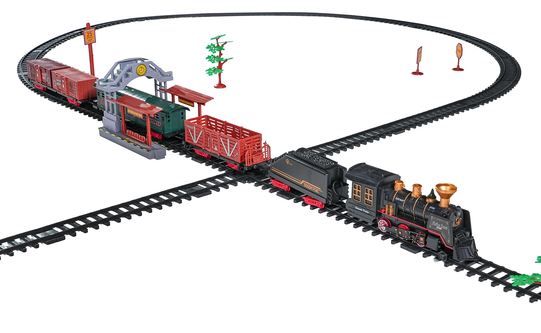Součástí balení je kompletní vlaková souprava s lokomotivou, tendrem, osobním a nákladními vozy, sadou kolejí a tematickými doplňky jako stromky a značky. Set podporuje rozvoj fantazie, jemné motoriky i trpělivosti a je ideální jako dárek pro malé milovníky železnic.