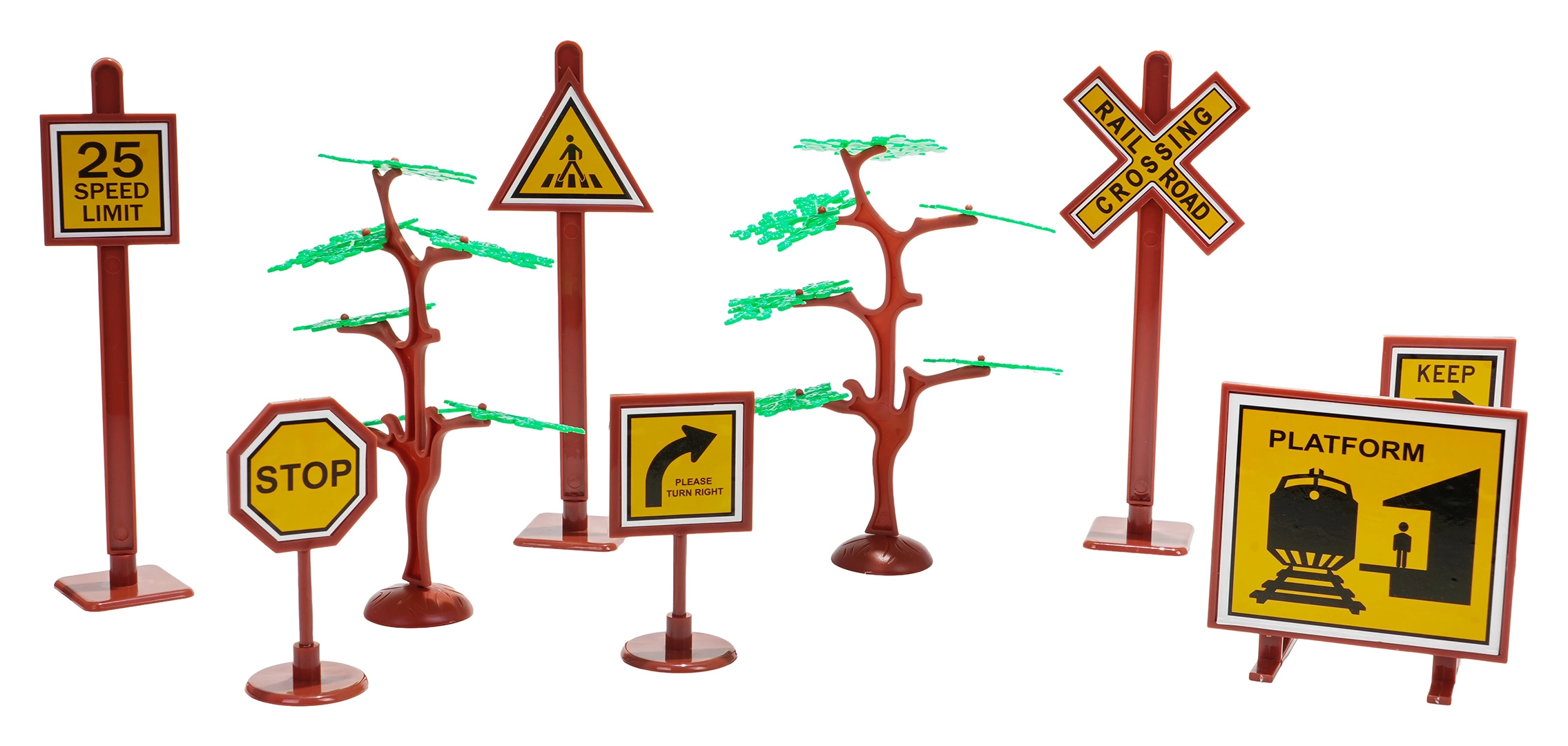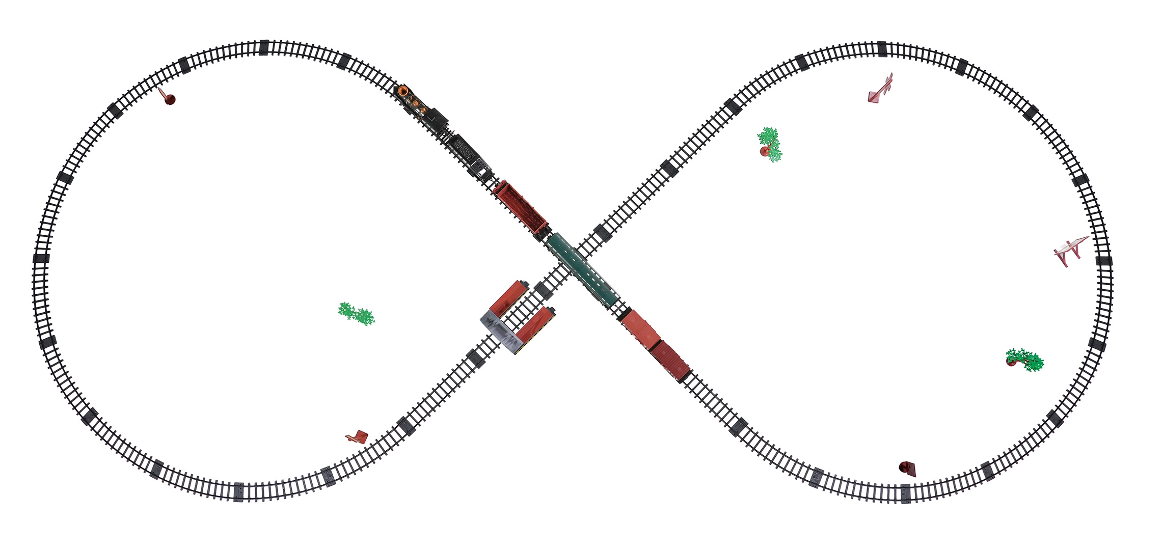 V balení najdete lokomotivu s tendrem, osobní i nákladní vozy, značky a stromky – vše pro kreativní hraní.