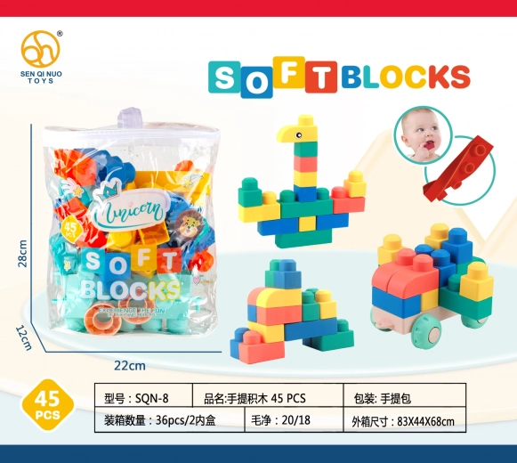 Tato barevná sada měkkých kostiček nabízí 45 dílků pro bezpečné a rozvojové hraní. Materiál je šetrný k dětem i k životnímu prostředí, kostky jsou lehké, bez ostrých zakončení a po ohnutí se vracejí do původního tvaru. Snadná údržba – stačí omýt či vyvařit, barvy zůstávají stále syté.