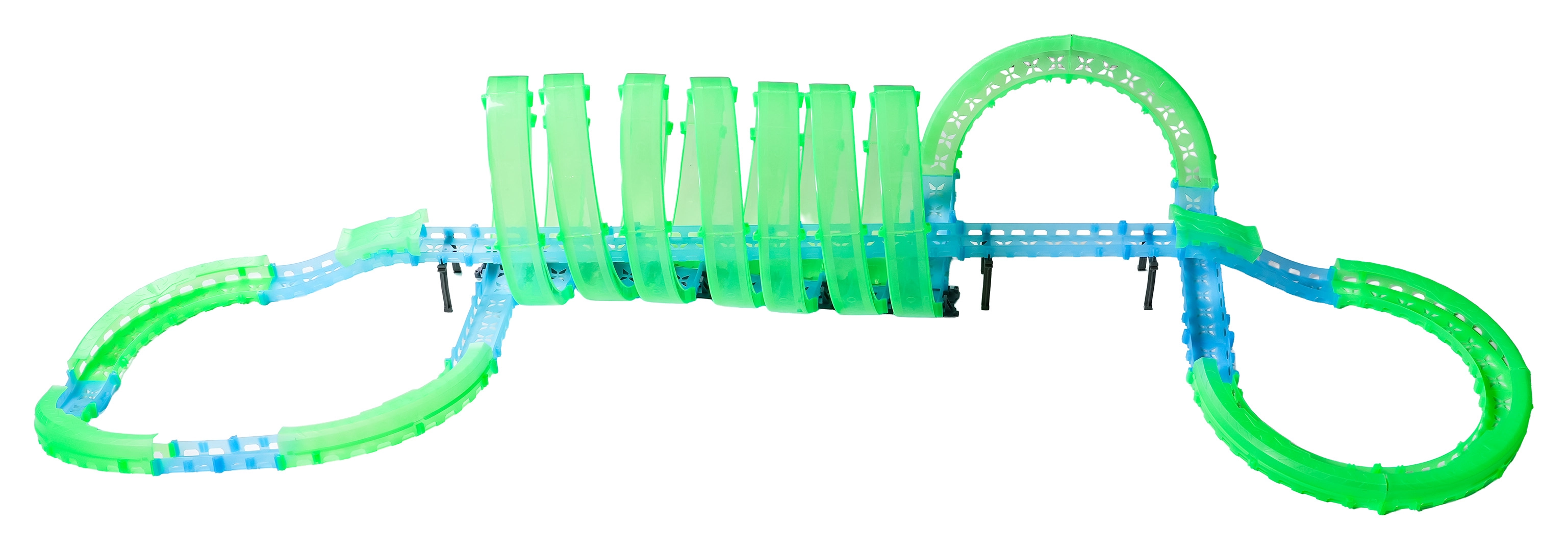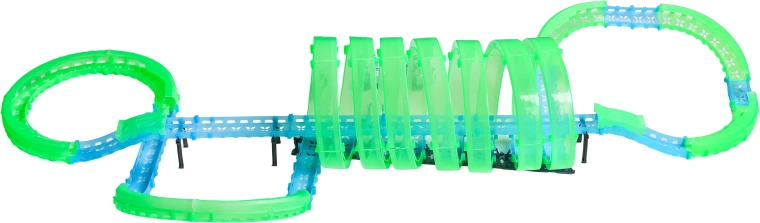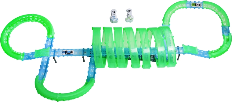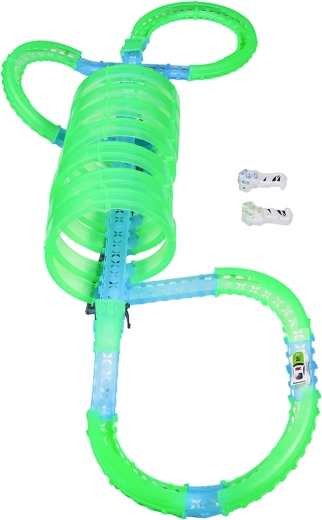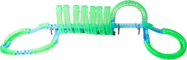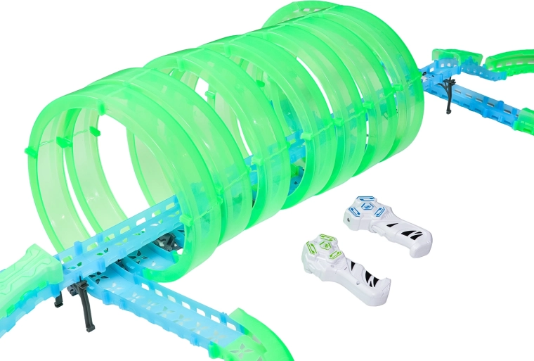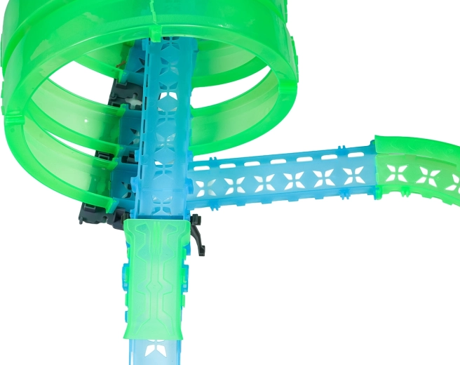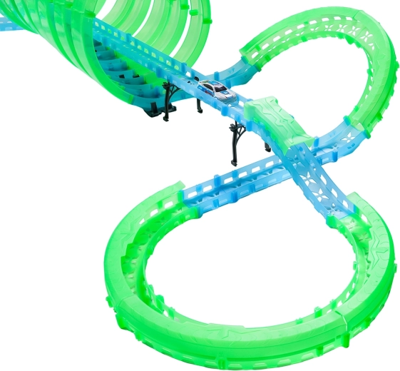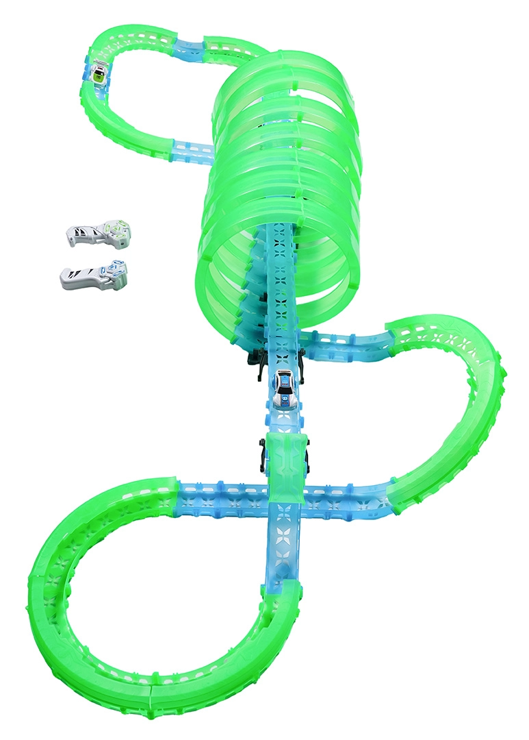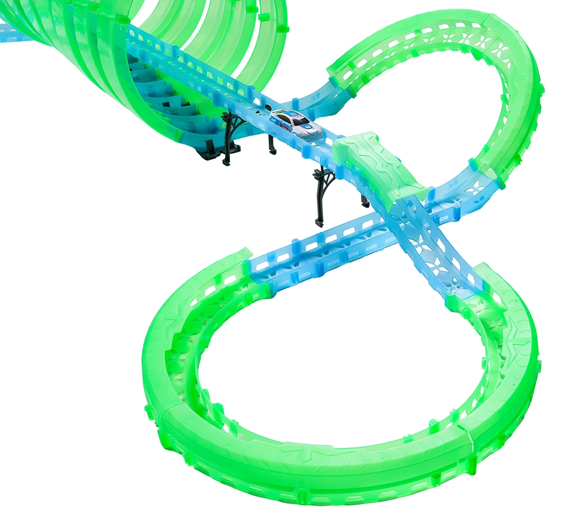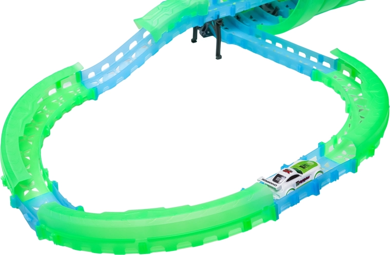 Tato modulární závodní dráha ze světlovodných dílů v neonově zelené a modré barvě se snadno zacvakává a umožňuje rychlé přestavby. Fluorescenční materiál se po nasvícení rozzáří a v kombinaci s LED autíčky promění pokoj v poutavou světelnou arénu.