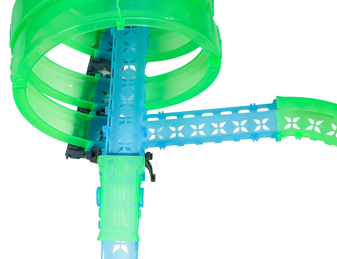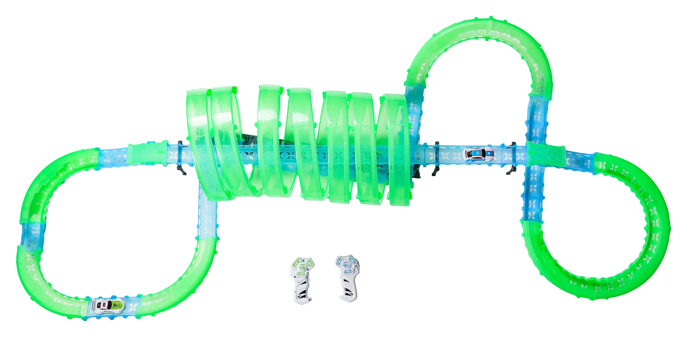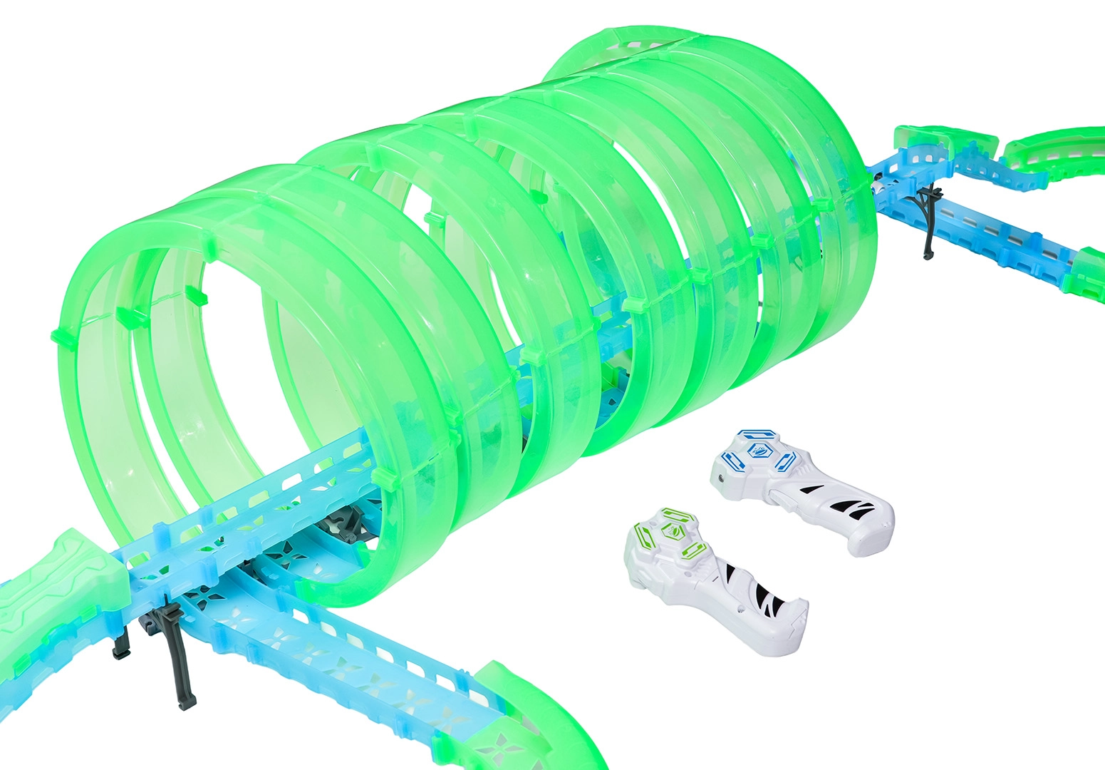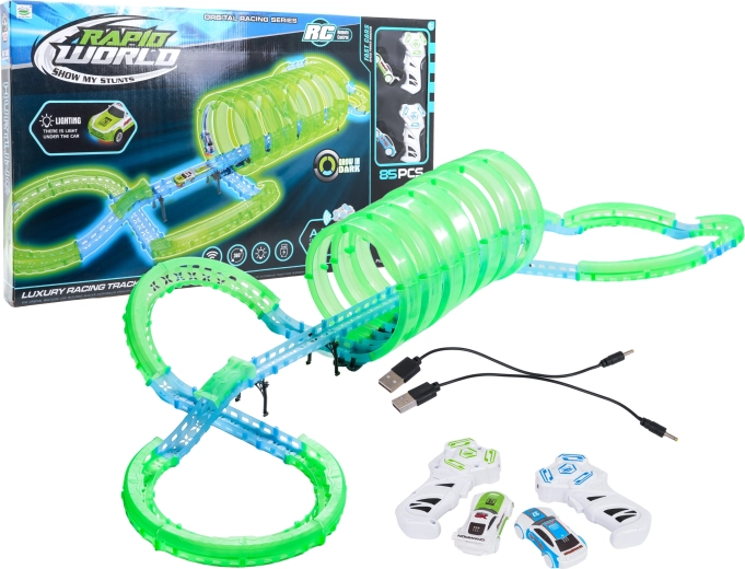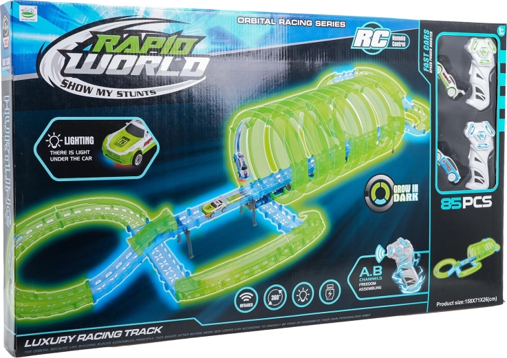Tato modulární závodní dráha ze světlovodných dílů v neonově zelené a modré barvě se snadno zacvakává a umožňuje rychlé přestavby. Fluorescenční materiál se po nasvícení rozzáří a v kombinaci s LED autíčky promění pokoj v poutavou světelnou arénu.
