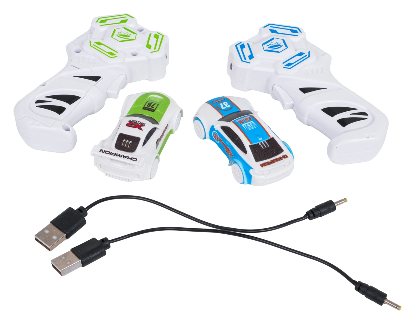 - 2 × autíčko, 2 × dálkový ovladač, 2 × USB nabíjecí kabel, stavební díly dráhy, návod