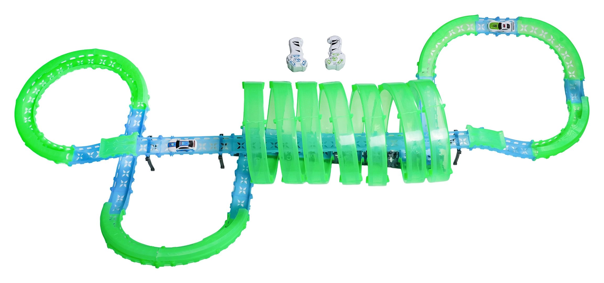 Součástí jsou dva ruční ovladače pro svižné závody ve dvou. Dráha obsahuje několik 360° smyček, vyvýšené úseky i tunelové sekce pro dynamickou jízdu a kaskadérské triky.