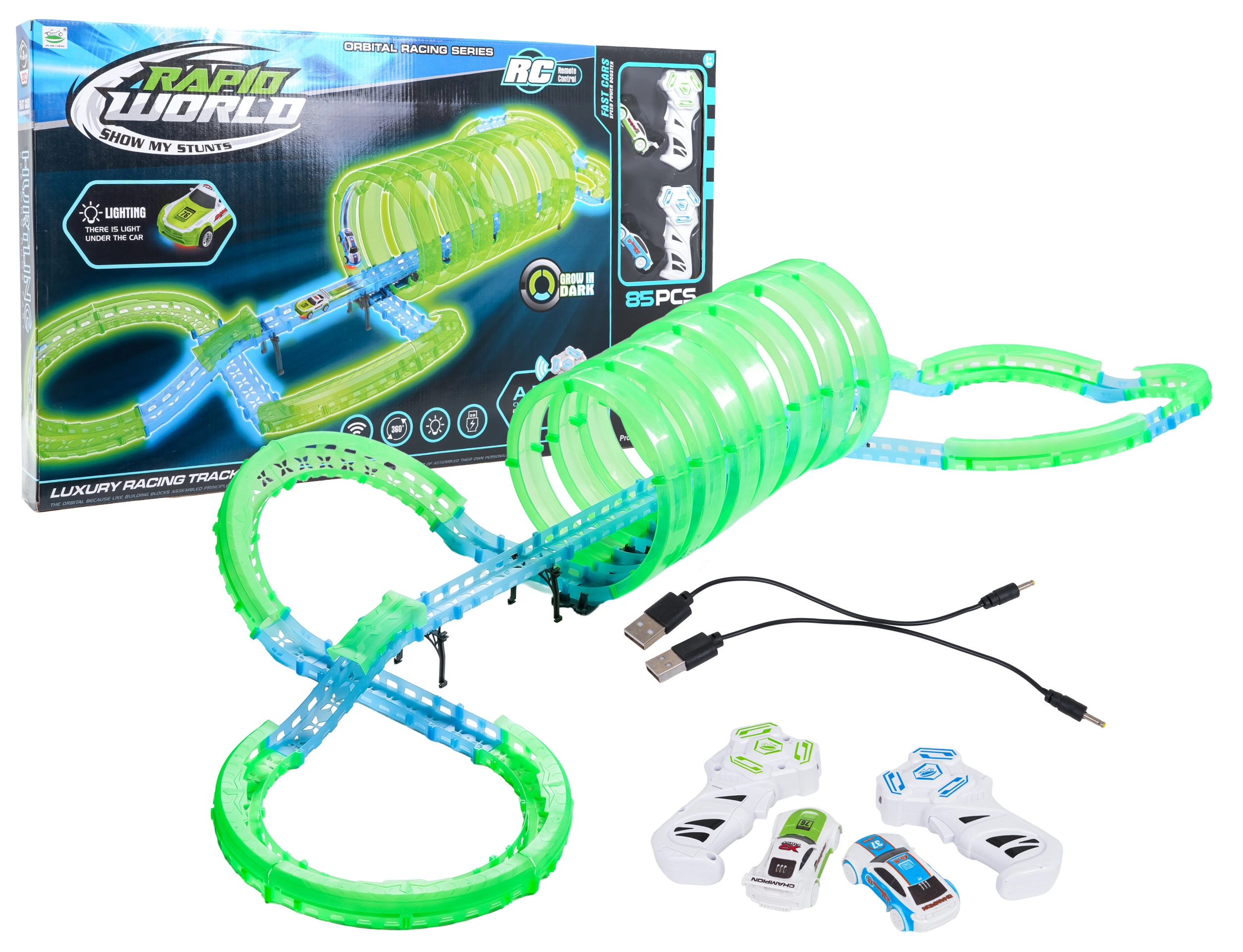 - fluorescenční dráha, LED podsvícení aut, více 360° smyček