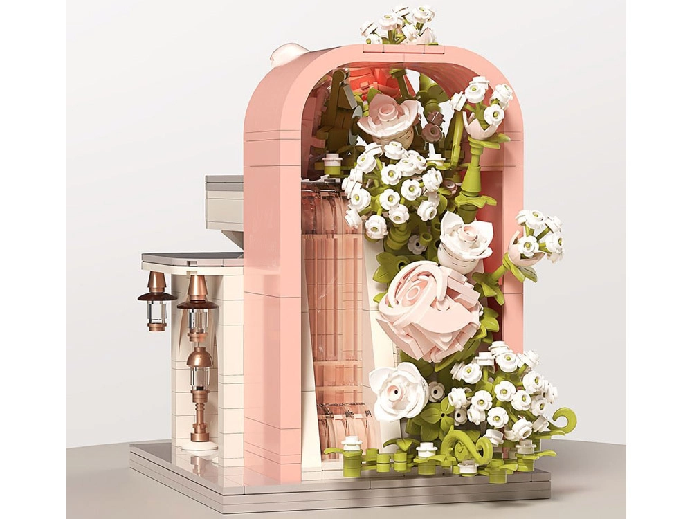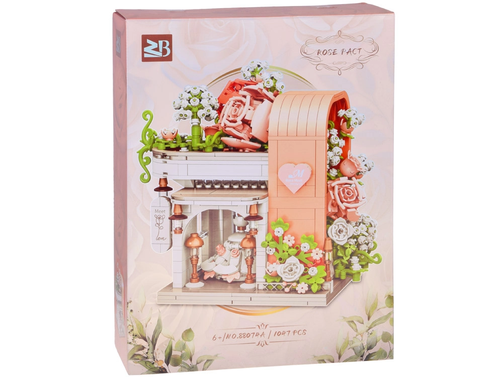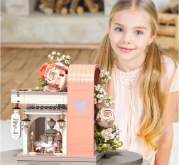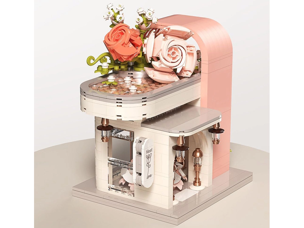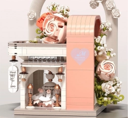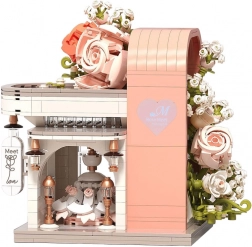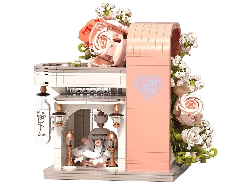 Tato romantická stavebnice promění váš stůl v malebnou svatební scénu. Elegantní výloha s „proskleným“ čelem odhaluje hlavní hvězdu – svatební šaty s jemnými růžovými detaily, které ladí s bílou, pudrově růžovou a pastelově zelenou. Konstrukci obepínají bohaté květinové girlandy, ozdoby na střeše a drobné lampy u vstupu, díky nimž model působí jako bajková výloha.