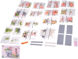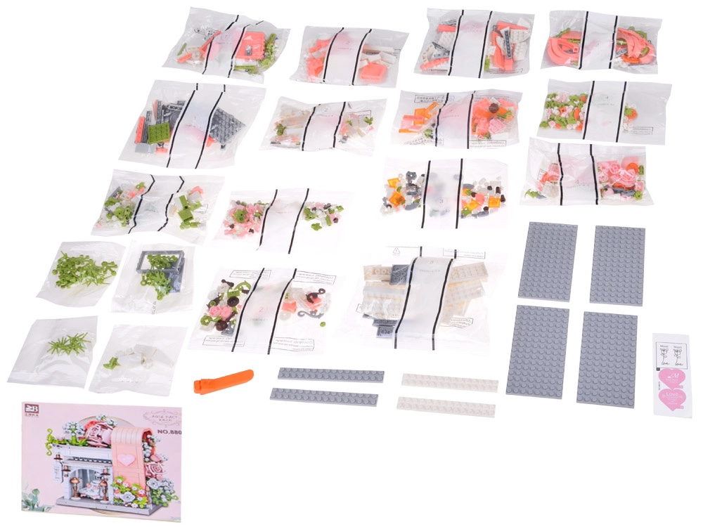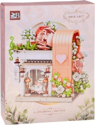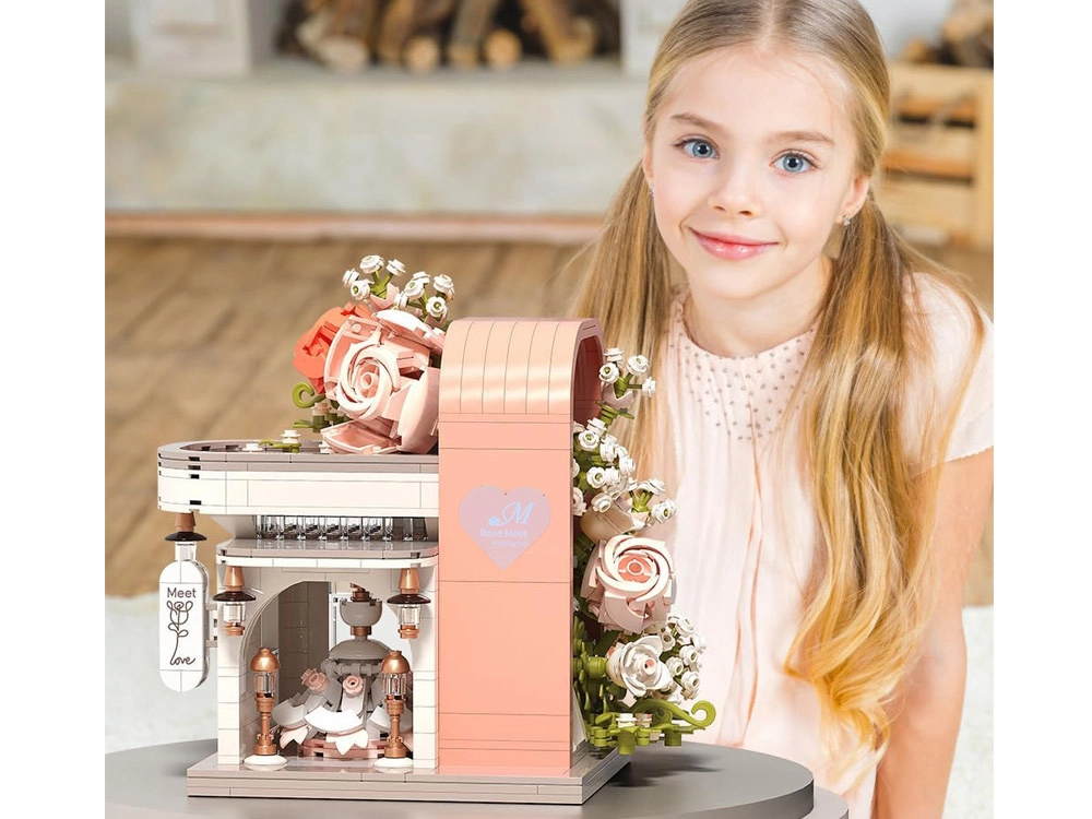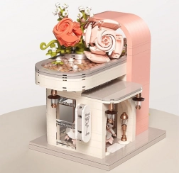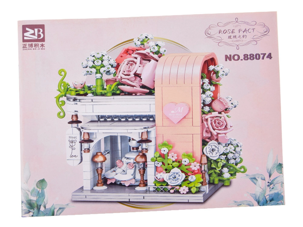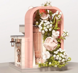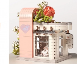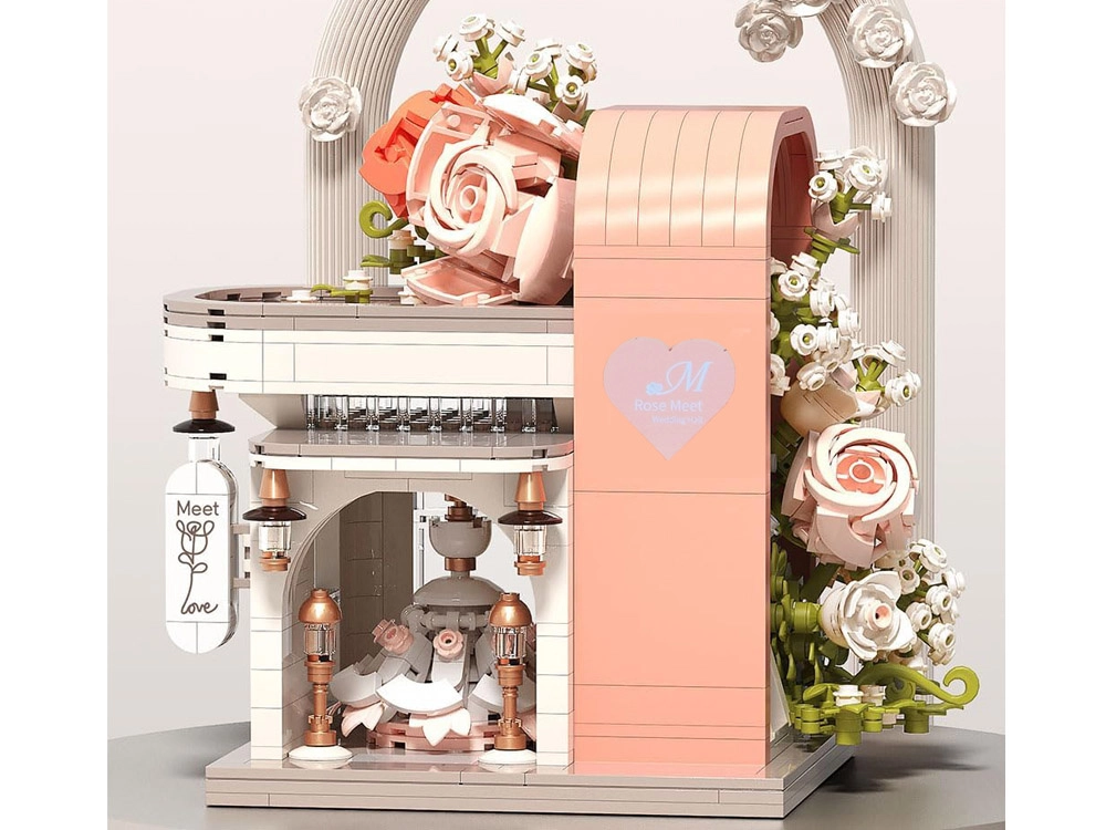 Tato romantická stavebnice promění váš stůl v malebnou svatební scénu. Elegantní výloha s „proskleným“ čelem odhaluje hlavní hvězdu – svatební šaty s jemnými růžovými detaily, které ladí s bílou, pudrově růžovou a pastelově zelenou. Konstrukci obepínají bohaté květinové girlandy, ozdoby na střeše a drobné lampy u vstupu, díky nimž model působí jako bajková výloha.