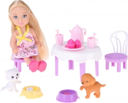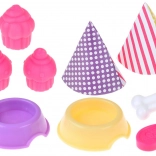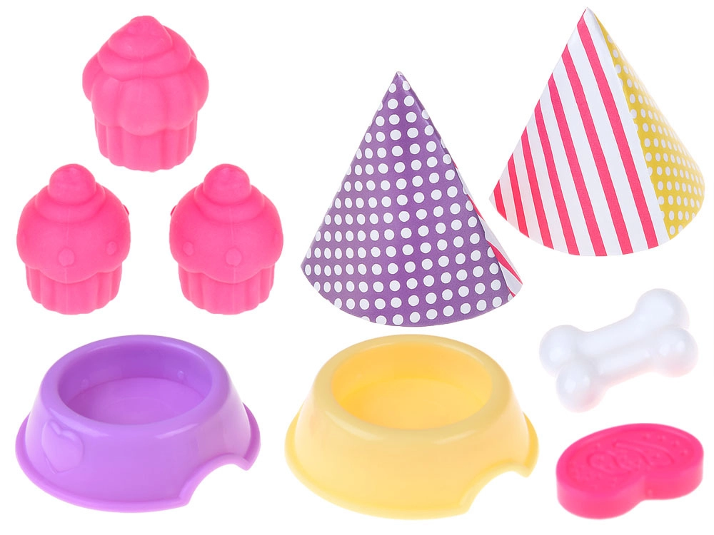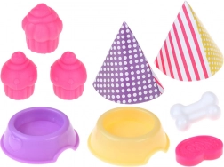 Souprava obsahuje pestrou škálu příslušenství, které dětem umožní vytvářet stále nové příběhy: od stolku a židliček přes misky pro zvířátka, příbory a nádobí až po papírové párty čepičky. Vše je lehké, dobře padnoucí do dětských rukou a připravené na dlouhé hodiny rolových her.