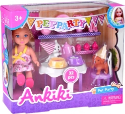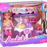 Sada Ankiki Pet Party promění každý den v veselou narozeninovou oslavu. Děti mohou usadit panenku ke stolečku, naservírovat čaj z růžového čajového servisu, rozdělit dobroty a cupcakes a postarat se o dva roztomilé mazlíčky – bílou kočičku a hnědého pejska. Pastelové barvy a přátelský design podněcují fantazii a něžnou atmosféru hry.