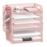 Stylový kovový organizér na psací stůl v růžové barvě udrží vaše pracovní místo přehledné a elegantní. Nabízí 5 prostorných přihrádek pro doplňky do kanceláře, je vyroben z lakovaného kovu se síťovanou konstrukcí pro odolnost a stabilitu. Díky kompaktním rozměrům se vejde na každý stůl a vnese do interiéru pořádek i moderní design.