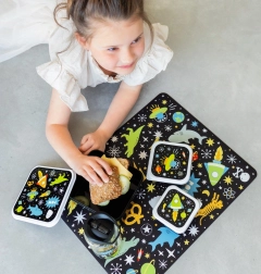 Toto černé vinylové prostírání s vesmírným motivem zaujme děti i rodiče. Díky protiskluzové vrstvě pevně drží na stole a jeho prostorný formát poskytuje dostatek místa pro talíř, příbory i kreativní aktivity. Materiál se velmi snadno čistí – stačí ho otřít vlhkým hadříkem.