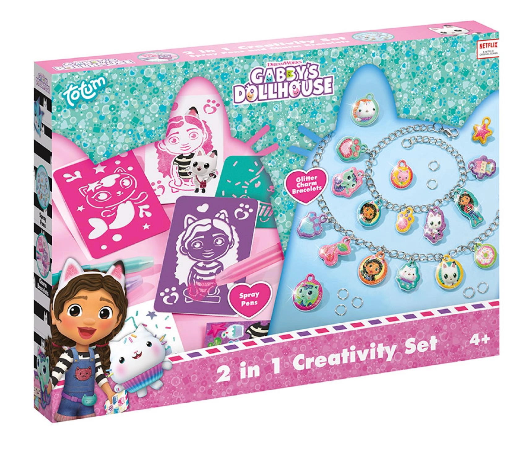 Objevte zábavnou kreativní sadu 2v1, se kterou děti vytvoří vlastní obrázky pomocí foukacích fixů a navíc si vyrobí stylové náramky s přívěsky s motivy GABBY'S DOLLHOUSE. Sada rozvíjí kreativitu, jemnou motoriku a fantazii – ideální dárek pro malé tvůrce od 4 let.